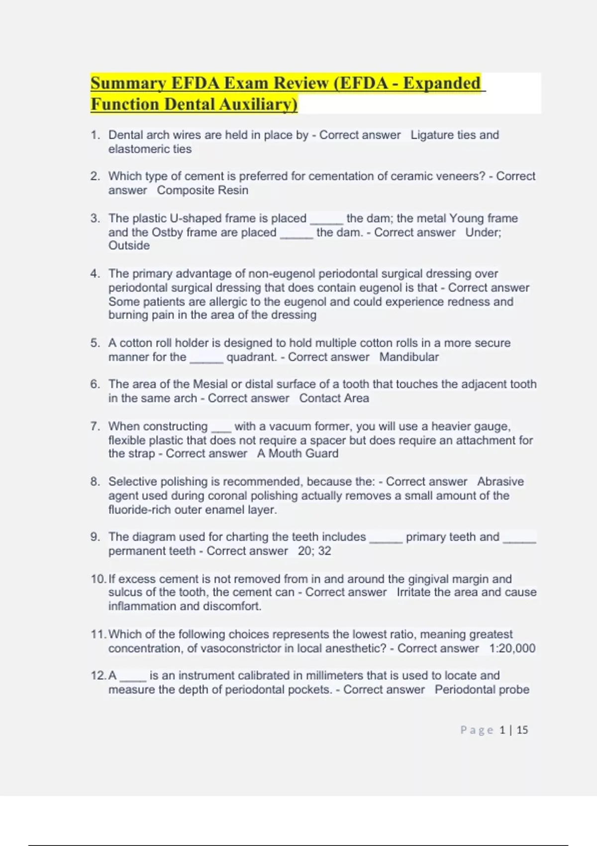 Summary EFDA Exam Review (EFDA - Expanded Function Dental Auxiliary)Summary EFDA Exam Review (EFDA - Expanded Function Dental Auxiliary)Summary EFDA Exam Review (EFDA - Expanded Function Dental Auxiliary)