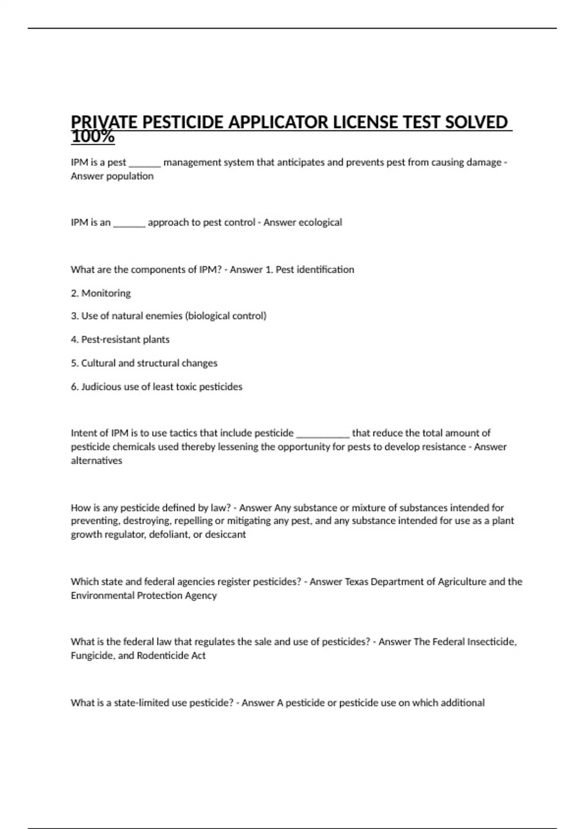 PRIVATE PESTICIDE APPLICATOR LICENSE TEST SOLVED 100%