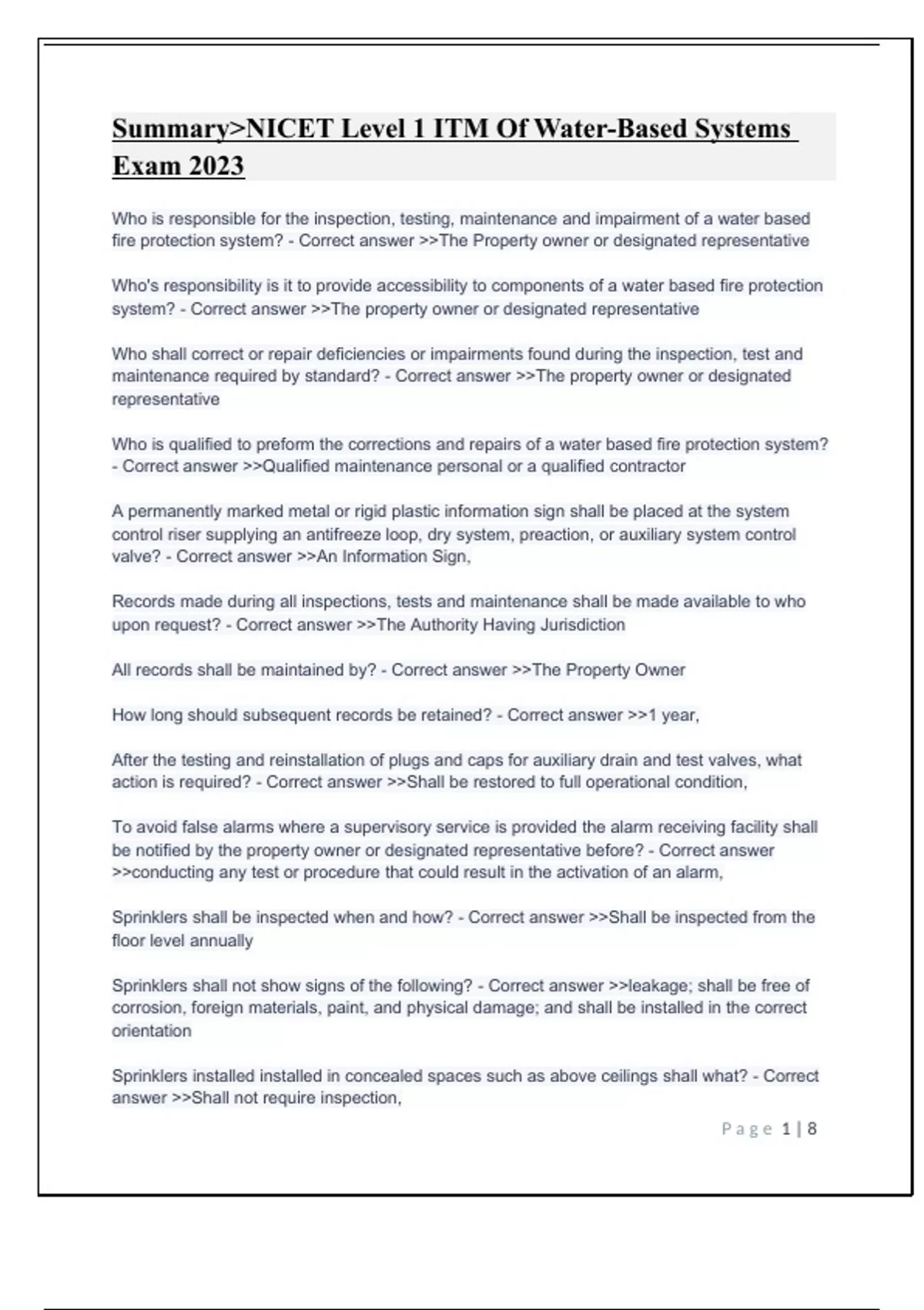 SummaryNICET Level 1 ITM Of Water-Based Systems Exam 2023SummaryNICET Level 1 ITM Of Water-Based Systems Exam 2023SummaryNICET Level 1 ITM Of Water-Based Systems Exam 2023