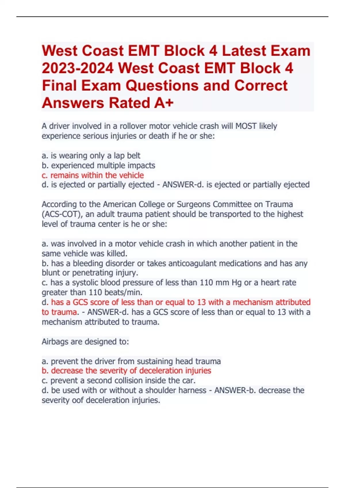 West Coast EMT Block 4 Latest Exam West Coast EMT Block 4 Final Exam Questions and Correct Answers Rated A+