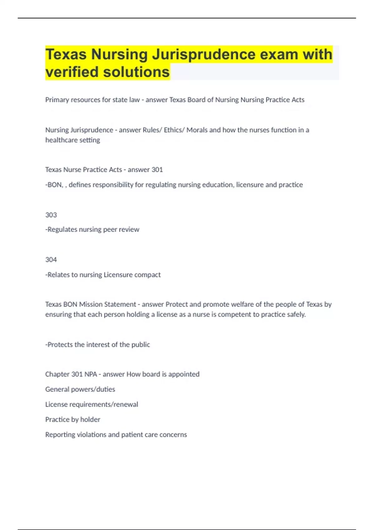 Texas Nursing Jurisprudence exam with verified solutions.