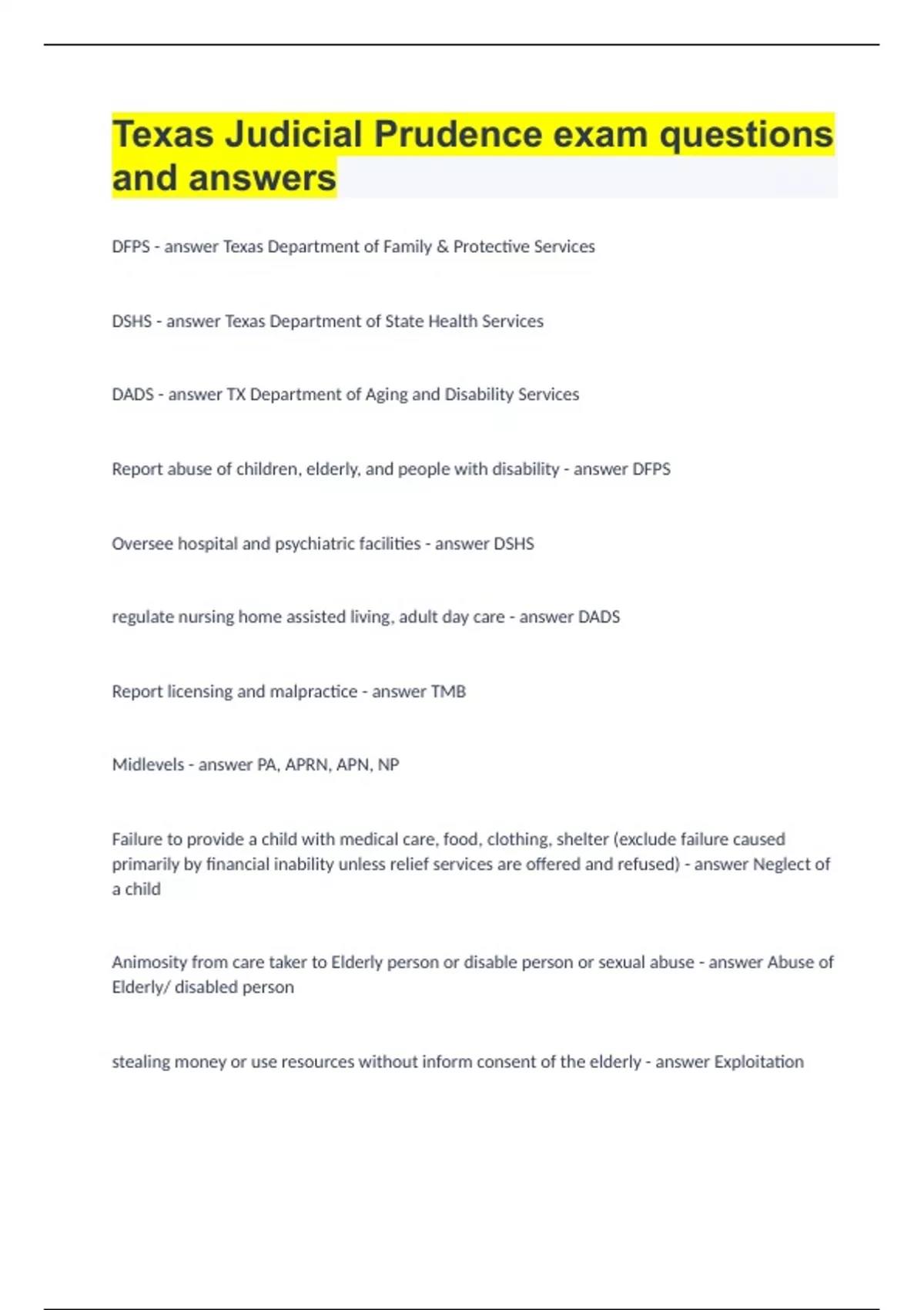 Texas Judicial Prudence exam questions and answers.