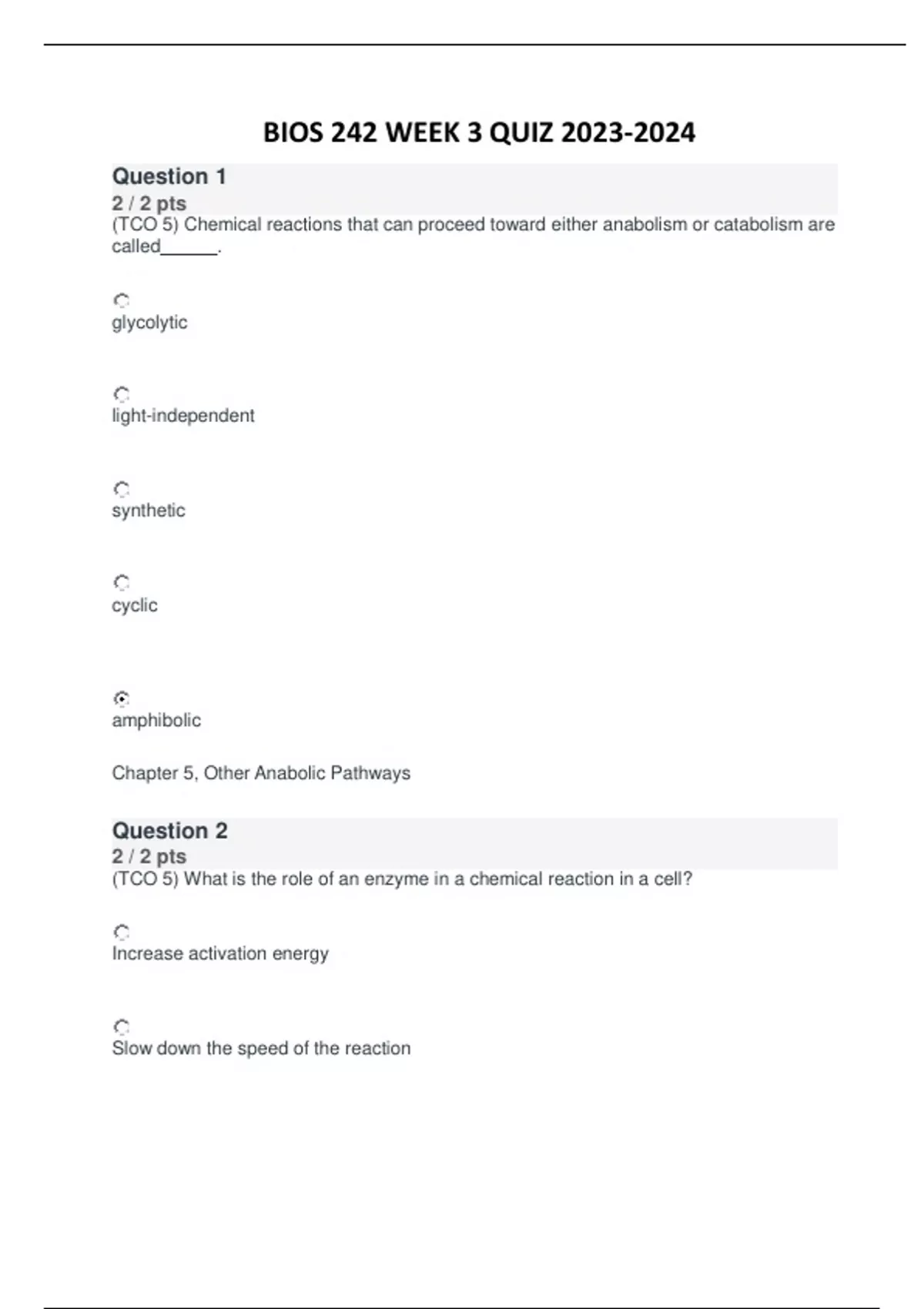 BIOS 242 WEEK 3 QUIZ (TCO 5) Chemical reactions that can proceed toward either anabolism or catabolism are called . glycolytic light-independent synthetic cyclic amphibolic Chapter 5, Other Anabolic Pathways (TCO 5) What is the role of an enzyme in a chemical reaction in a cell? Increase activation energy Slow down the speed of the reaction Halt the progression of the reaction Decrease activation energy Alter the shape of an enzyme’s activation site Chapter 5, The Role of Enzymes in Metabolism