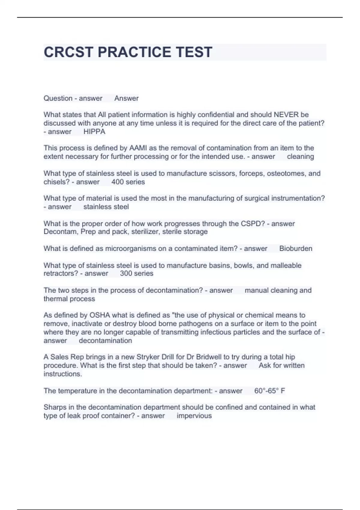 Exam of 13 pages for the course CRCST at CRCST (CRCST PRACTICE TEST)