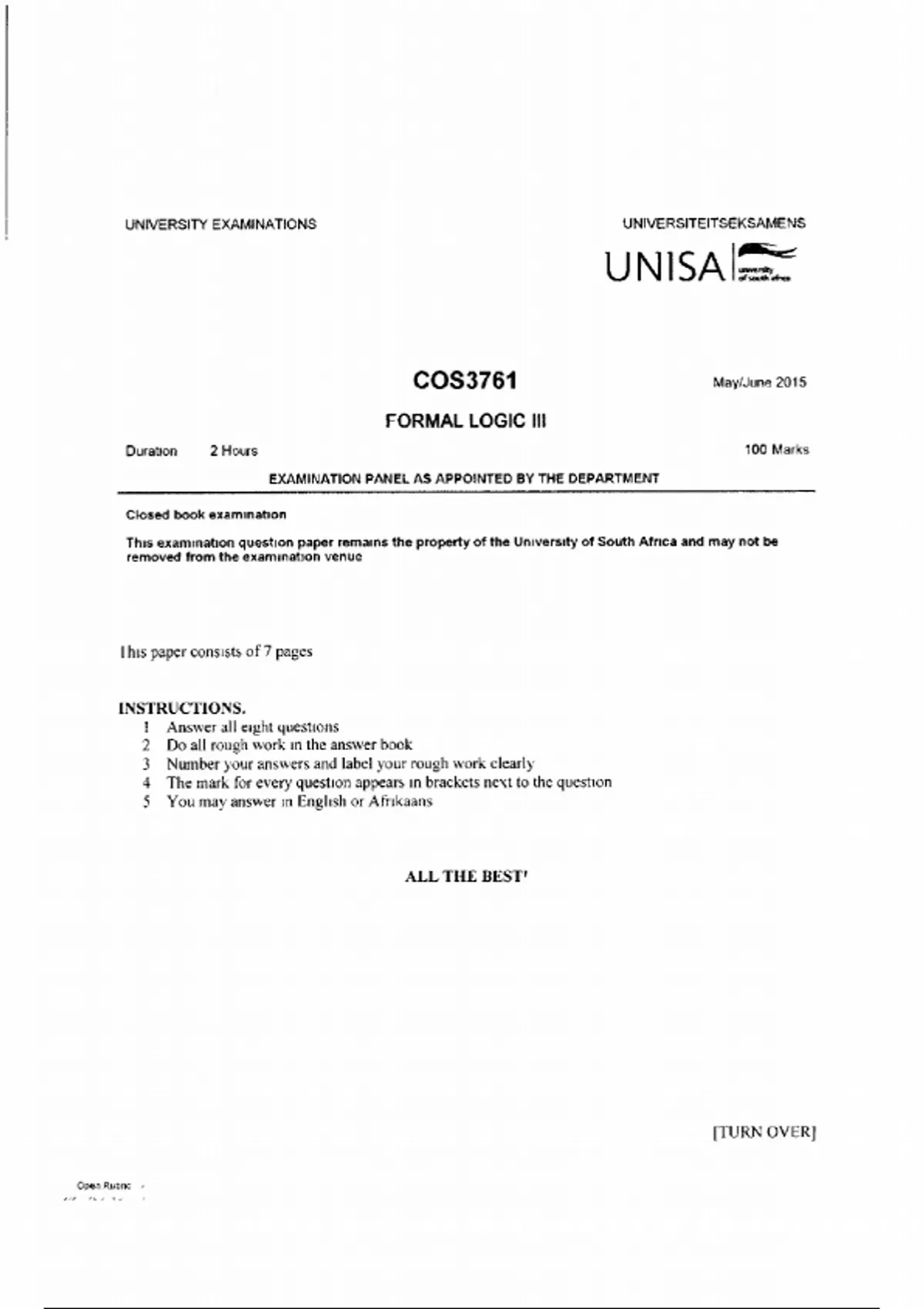 This examination question paper remains the property of the University of South Africa and may nat be