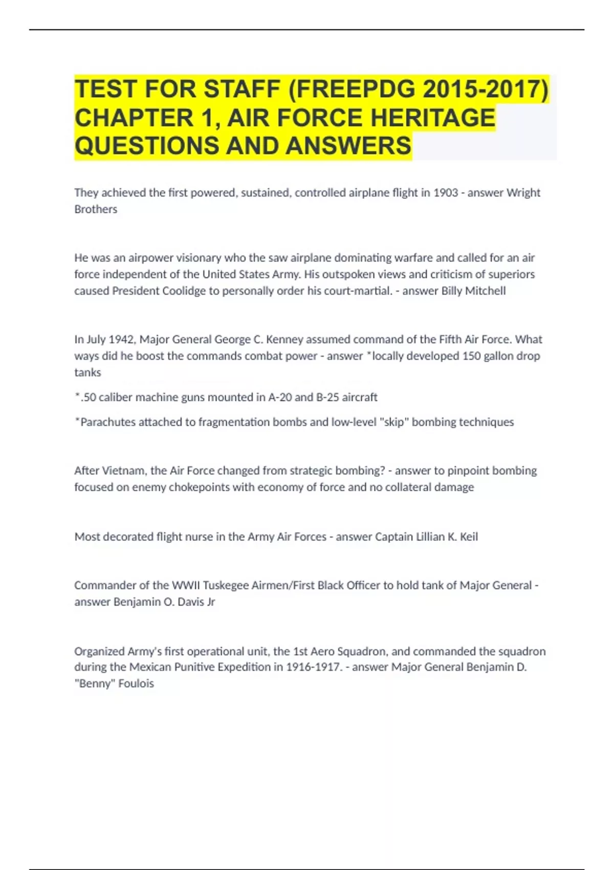 TEST FOR STAFF (FREEPDG ) CHAPTER 1, AIR FORCE HERITAGE QUESTIONS AND ANSWERS