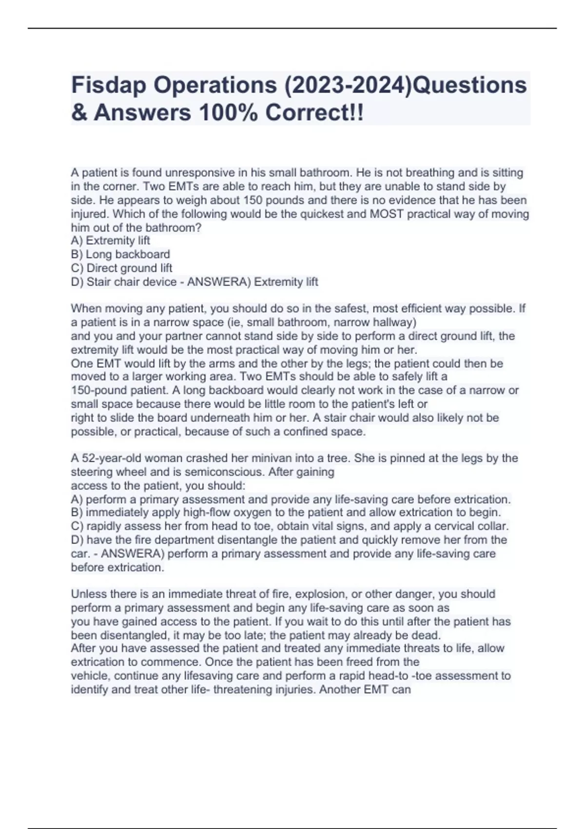 A patient is found unresponsive in his small bathroom. He is not breathing and is sitting in the corner. Two EMTs are able to reach him, but they are unable to stand side by side. He appears to weigh about 150 pounds and there is no evidence that he has been injured. Which of the following would be the quickest and MOST practical way of moving him out of the bathroom? A) Extremity lift B) Long backboard C) Direct ground lift D) Stair chair device - ANSWERA) Extremity lift When moving any patient, you should do so in the safest, most efficient way possible. If a patient is in a narrow space (ie, small bathroom, narrow hallway) and you and your partner cannot stand side by side to perform a direct ground lift, the extremity lift would be the most practical way of moving him or her. One EMT would lift by the arms and the other by the legs; the patient could then be moved to a larger working area. Two EMTs should be able to safely lift a 150-pound patient. A long backboard would clearly not work in the case of a narrow or small space because there would be little room to the patient's left or right to slide the board underneath him or her. A stair chair would also likely not be possible, or practical, because of such a confined space. A 52-year-old woman crashed her minivan into a tree. She is pinned at the legs by the steering wheel and is semiconscious. After gaining access to the patient, you should: A) perform a primary assessment and provide any life-saving care before extrication. B) immediately apply high-flow oxygen to the patient and allow extrication to begin. C) rapidly assess her from head to toe, obtain vital signs, and apply a cervical collar. D) have the fire department disentangle the patient and quickly remove her from the car. - ANSWERA) perform a primary assessment and provide any life-saving care before extrication. Unless there is an immediate threat of fire, explosion, or other danger, you should perform a primary assessment and begin any life-saving care as soon as you have gained access to the patient. If you wait to do this until after the patient has been disentangled, it may be too late; the patient may already be dead. After you have assessed the patient and treated any immediate threats to life, allow extrication to commence. Once the patient has been freed from the vehicle, continue any lifesaving care and perform a rapid head-to -toe assessment to id