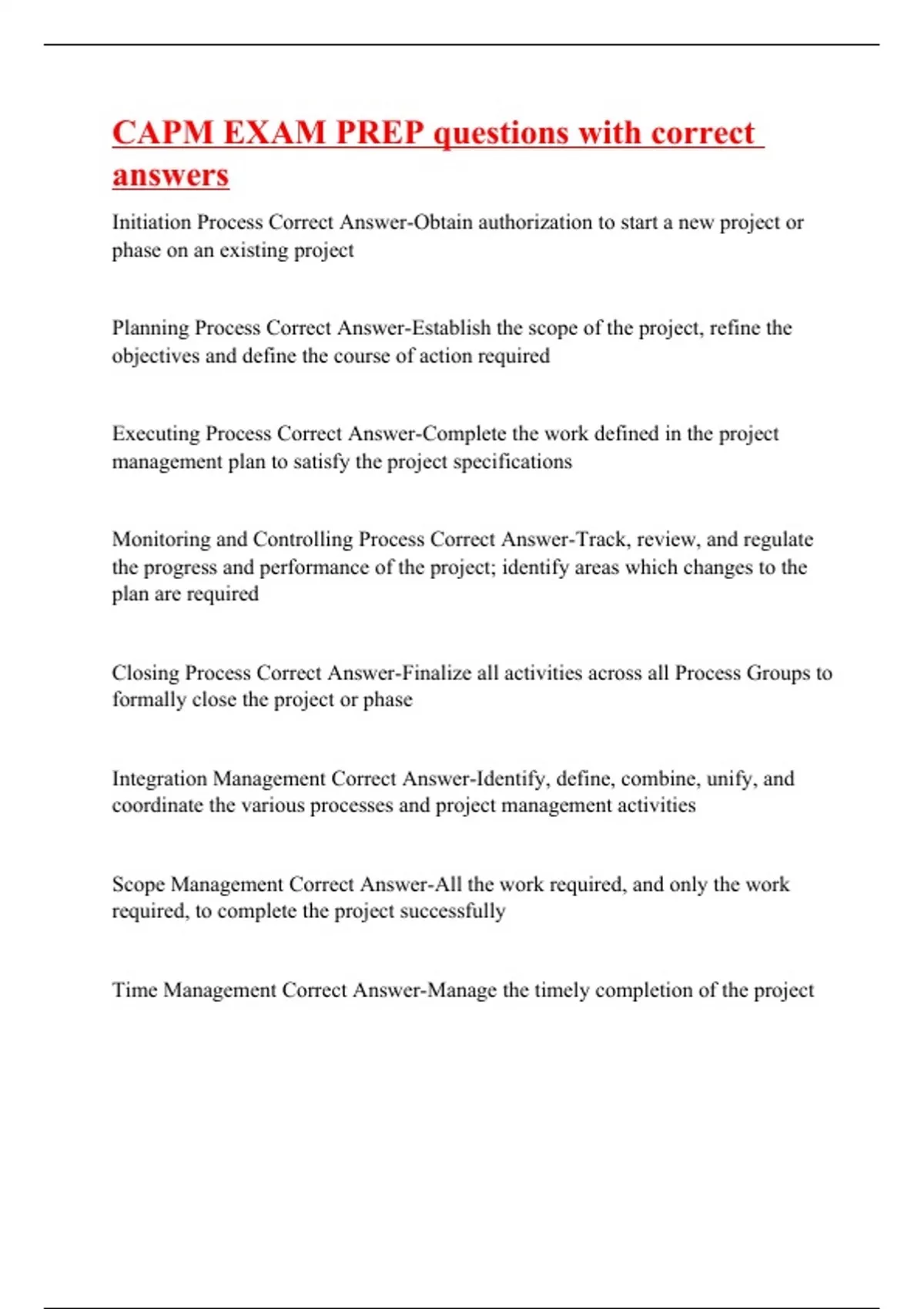 Initiation Process Correct Answer-Obtain authorization to start a new project or phase on an existing project Planning Process Correct Answer-Establish the scope of the project, refine the objectives and define the course of action required Executing Process Correct Answer-Complete the work defined in the project management plan to satisfy the project specifications Monitoring and Controlling Process Correct Answer-Track, review, and regulate the progress and performance of the project; identify areas which changes to the plan are required Closing Process Correct Answer-Finalize all activities across all Process Groups to formally close the project or phase Integration Management Correct Answer-Identify, define, combine, unify, and coordinate the various processes and project management activities Scope Management Correct Answer-All the work required, and only the work required, to complete the project successfully Time Management Correct Answer-Manage the timely completion of the project Cost Management Correct Answer-Planning, estimating, budgeting, financing, funding, managing, and controlling costs so that the project can be completed within the approved budget