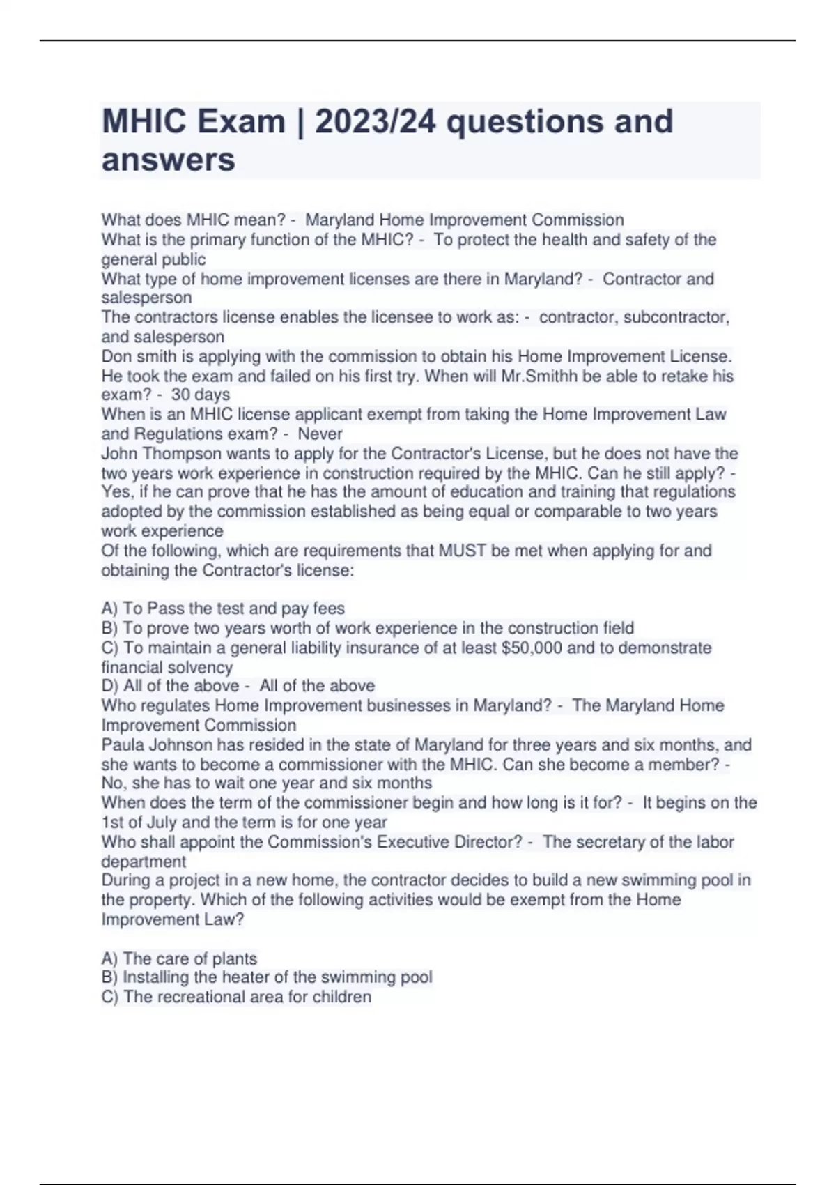 MHIC Exam | 2023/24 questions and answers What does MHIC mean? - Maryland Home Improvement Commission What is the primary function of the MHIC? - To protect the health and safety of the general public What type of home improvement licenses are there in Maryland? - Contractor and salesperson The contractors license enables the licensee to work as: - contractor, subcontractor, and salesperson Don smith is applying with the commission to obtain his Home Improvement License. He took the exam and failed on his first try. When will Mr.Smithh be able to retake his exam? - 30 days When is an MHIC license applicant exempt from taking the Home Improvement Law and Regulations exam? - Never John Thompson wants to apply for the Contractor's License, but he does not have the two years work experience in construction required by the MHIC. Can he still apply? - Yes, if he can prove that he has the amount of education and training that regulations adopted by the commission established as being equal or comparable to two years work experience Of the following, which are requirements that MUST be met when applying for and obtaining the Contractor's license: A) To Pass the test and pay fees B) To prove two years worth of work experience in the construction field C) To maintain a general liability insurance of at least $50,000 and to demonstrate financial solvency