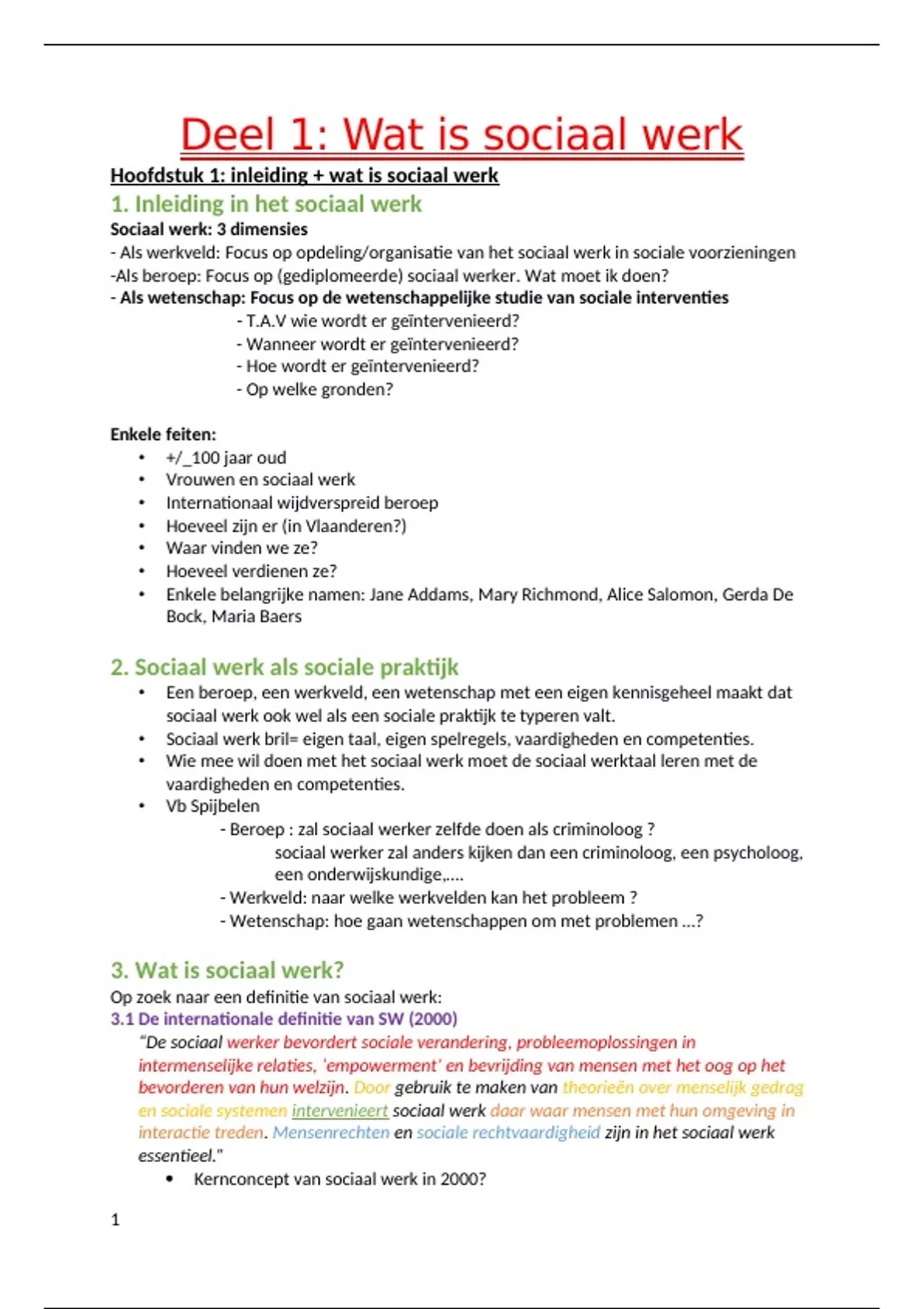 Complete samenvatting van het vak 'studie van sociaal werk' (1ste Bachelor Sociaal werk, HoGent) gedoceerd door Hildegard Gobeyn en Didier Reynaert. Met deze samenvatting ben ik geslaagd voor dit vak met een 14/20. Het document omvat: - Deel 1: Wat is sociaal werk - Deel 2: Wat doet het sociaal werk Met deze samenvatting heb je in één document alles om te slagen op dit opleidingsonderdeel!