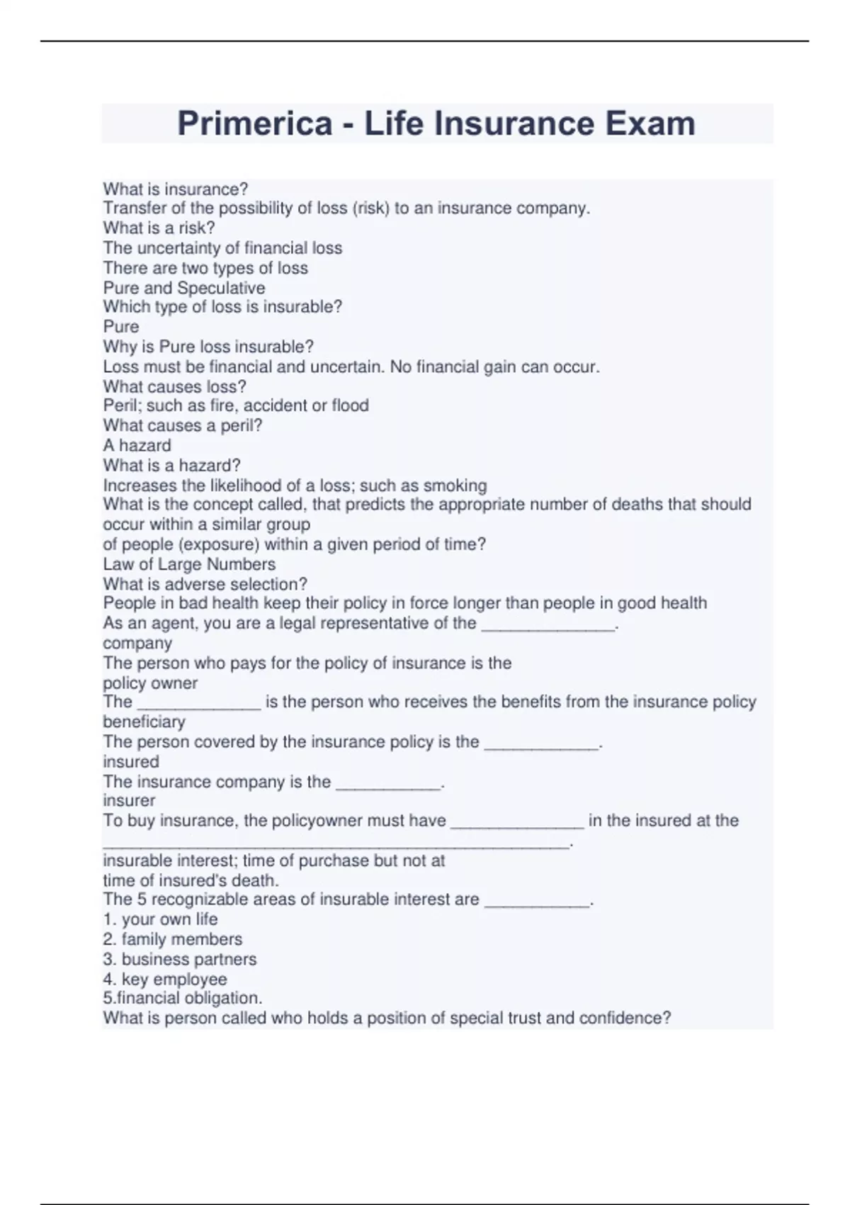 Primerica - Life Insurance Exam What is insurance? Transfer of the possibility of loss (risk) to an insurance company. What is a risk? The uncertainty of financial loss There are two types of loss Pure and Speculative Which type of loss is insurable? Pure Why is Pure loss insurable? Loss must be financial and uncertain. No financial gain can occur. What causes loss? Peril; such as fire, accident or flood What causes a peril? A hazard What is a hazard? Increases the likelihood of a loss; such as smoking What is the concept called, that predicts the appropriate number of deaths that should occur within a similar group of people (exposure) within a given period of time? Law of Large Numbers What is adverse selection? People in bad health keep their policy in force longer than people in good health As an agent, you are a legal representative of the ______________. company The person who pays for the policy of insurance is the policy owner The _____________ is the person who receives the benefits from the insurance policy beneficiary The person covered by the insurance policy is the ____________. insured The insurance company is the ___________. insurer To buy insurance, the policyowner must have ______________ in the insured at the _________________________________________________. insurable interest; time of purchase but not at time of insured's death. The 5 recognizable areas of insurable interest are ___________. 1. your own life 2. family members 3. business partners 4. key employee cial obligation. What is person called who holds a position of special trust and confidence?