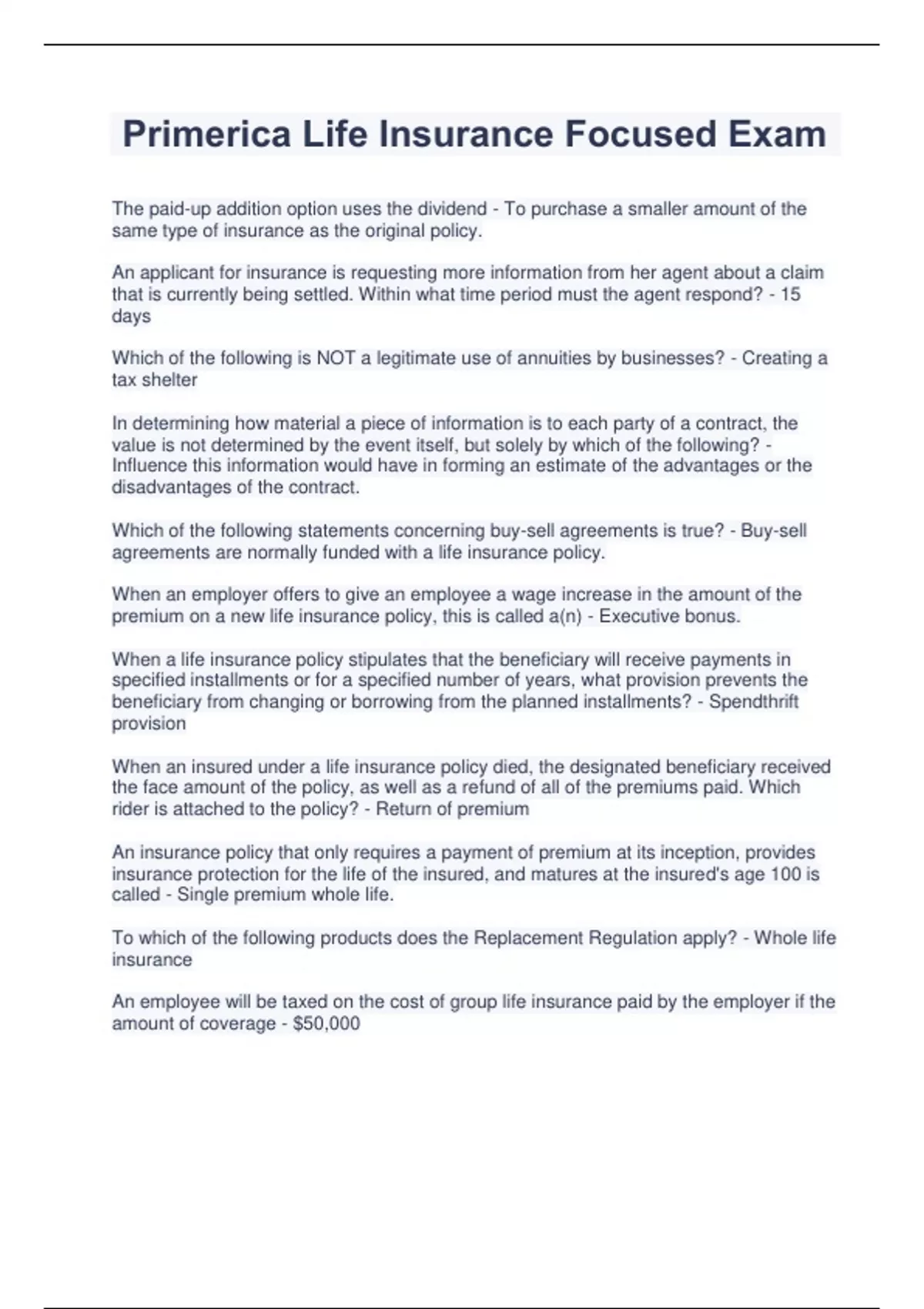 Primerica Life Insurance Focused Exam