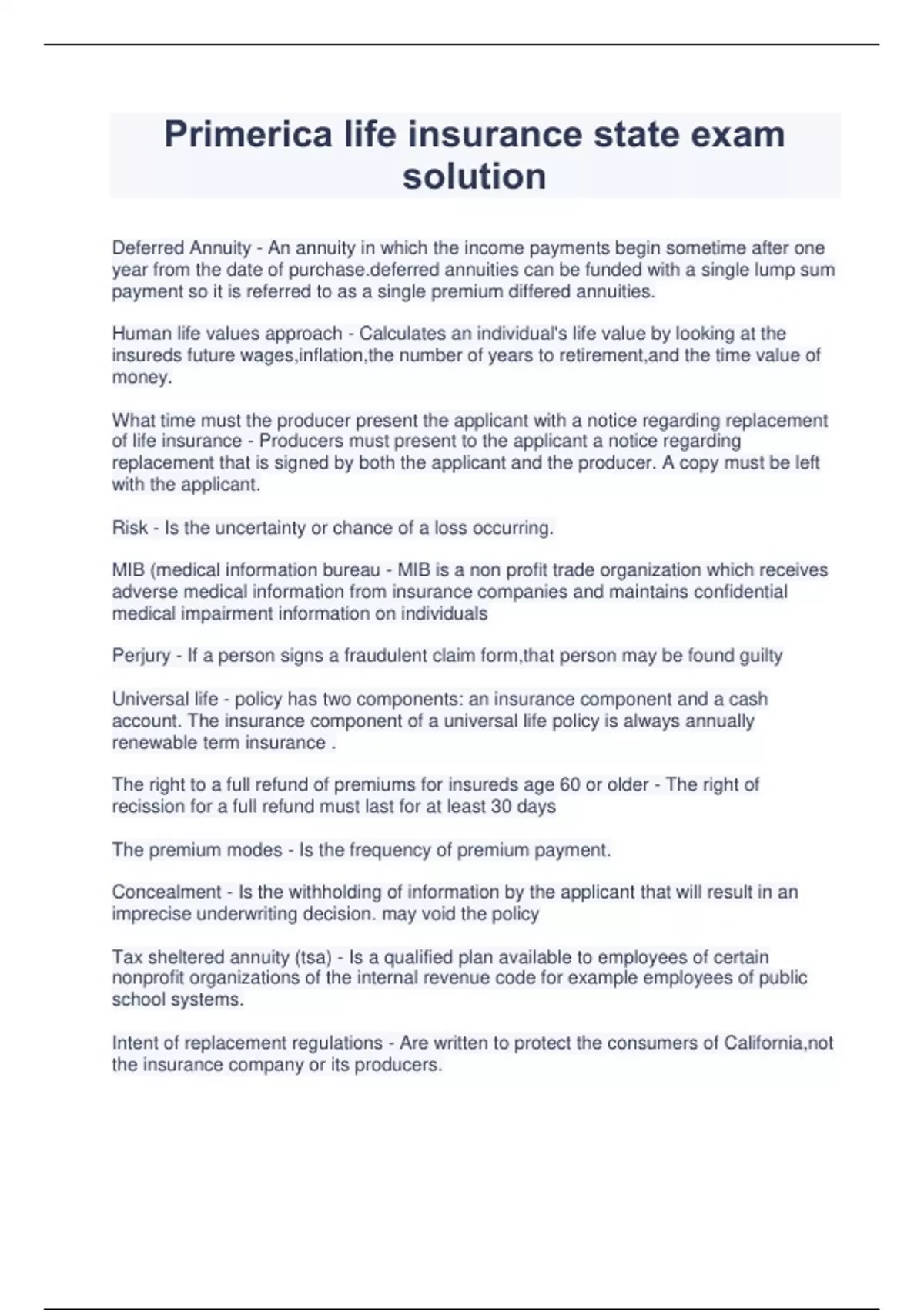 Primerica life insurance state exam solution Deferred Annuity - An annuity in which the income payments begin sometime after one year from the date of purchase.deferred annuities can be funded with a single lump sum payment so it is referred to as a single premium differed annuities. Human life valu es approach - Calculates an individual's life value by looking at the insureds future wages,inflation,the number of years to retirement,and the time value of money. What time must the producer present the applicant with a notice regarding replacement of life insurance - Producers must present to the applicant a notice regarding replacement that is signed by both the applicant and the producer. A copy must be left with the applicant. Risk - Is the uncertainty or chance of a loss occurring. MIB (medical in formation bureau - MIB is a non profit trade organization which receives adverse medical information from insurance companies and maintains confidential medical impairment information on individuals Perjury - If a person signs a fraudulent claim form,that person may be found guilty Universal life - policy has two components: an insurance component and a cash account. The insurance component of a universal life policy is always annually renewable term insurance . The right to a full refund of premiums for insureds age 60 or older - The right of recission for a full refund must last for at least 30 days The premium modes - Is the frequency of premium payment. Concealment - Is the withholding of information by the applicant that will result in an imprecise underwriting decision. may void the policy Tax sheltered annuity (tsa) - Is a qualified plan available to employees of certain nonprofit organizations of the internal revenue code for example employees of public school systems. Intent of replacement reg ulations - Are written to protect the consumers of California,not the insurance company or its producers.