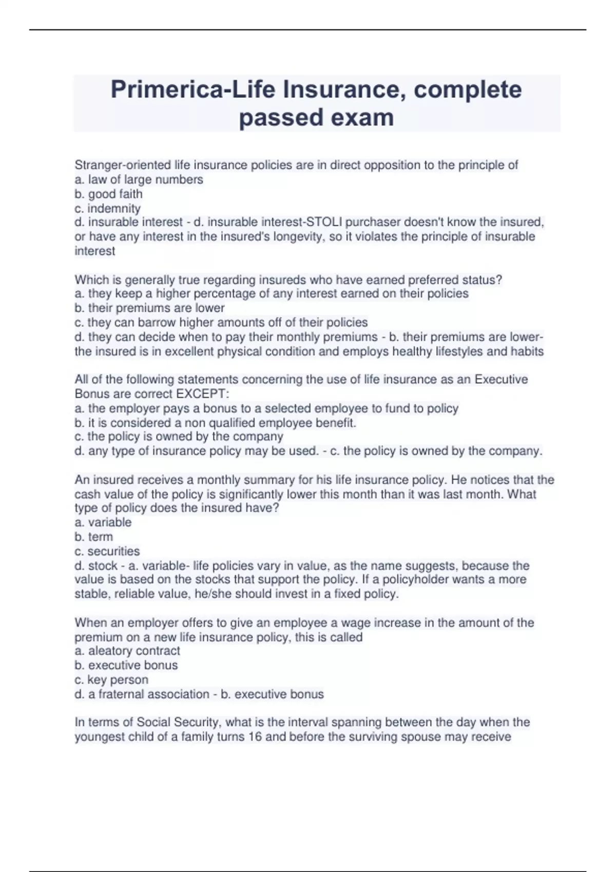 Primerica-Life Insurance, complete passed exam Stranger-oriented life insurance policies are in direct opposition to the principle of a. law of large numbers b. good faith c. indemnity d. insurable interest - d. insurable interest-STOLI purchaser doesn't know the insured, or have any interest in the insured's longevity, so it violates the principle of insurable interest Which is generally true regarding insureds who have earned preferred status? a. they keep a higher percentage of any interest earned on their policies b. their premiums are lower c. they can barrow higher amounts off of their policies d. they can decide when to pay their monthly premiums - b. their premiums are lowerthe insured is in excellent physical condition and employs healthy lifestyles and habits All of the following statements concerning the use of life insurance as an Executive Bonus are correct EXCEPT: a. the employer pays a bonus to a selected employee to fund to policy b. it is considered a non qualified employee benefit. c. the policy is owned by the company d. any type of insurance policy may be used. - c. the policy is owned by the company. An insured receives a monthly summary for his life insurance policy. He notices that the cash value of the policy is significantly lower this month than it was last month. What type of policy does the insured have? a. variable b. term c. securities d. stock - a. variable- life policies vary in value, as the name suggests, because the value is based on the stocks that support the policy. If a policyholder wants a more stable, reliable value, he/she should invest in a fixed policy. When an employer offers to give an employee a wage increase in the amount of the premium on a new life insurance policy, this is called a. aleatory contract b. executive bonus c. key person d. a fraternal association - b. executive bonus In terms of Social Security, what is the interval spanning between the day when the youngest child of a family turns 16 and before the surviving spouse may receive retirement benefits? - Blackout period- begins when the youngest child reaches the age of 16, and ends when the surviving spouse qualifies for retirement benefits, as early as age 60. No benefits are paid during this time. Life insurance may be used to pay state inheritance taxes and federal estate taxes so that it is not necessary to sell off assets from the estate to pay these costs. This is called a. estate conservation b. estate creation c. survivor protection d. survivorship insurnce - a. estate conservation- life insurance may be used to pay state inheritance taxes and federal estate taxes so that it is not necessary to sell off assets from the estate to pay these costs. This is called estate conservation. Which of the following applicants could the insurer charge a higher rate and not be charge with unfair discrimination? a. an applicant that was born in another country b. an applicant who is legally blind c. an applicant who has been a victim of domestic abuse d. an applicant that smokes cigarettes as opposed to one that does not - d. an applicant that smokes cigarettes as opposed to one that does not Partner A in a business buys a life insurance policy on Partner B to protect herself against a financial loss if he should die. Two years after the partnership is dissolved Partner B dies. Who will receive the death benefit? - Partner A Which of the following is NOT a type of information that needs to be gathered in order to determine the value of someone's life when using the needs approach? a. mortgages b. expenses c. estimated longevity d. outstanding debt - c. estimated longevity An employee will be taxed on the cost of group life insurance paid by the employer if the amount of coverage exceeds a. $10,000 b. $15,000 c. $25,000 d. $50,000 - d. $50,000 Which of the following would NOT fall into the category of costs associated with death? a. final medical expenses of the insured b. day to day expenses of maintaining the family c. the expense of a vacation for surviving family members d. funeral expenses - c. the expense of a vacation for surviving family members