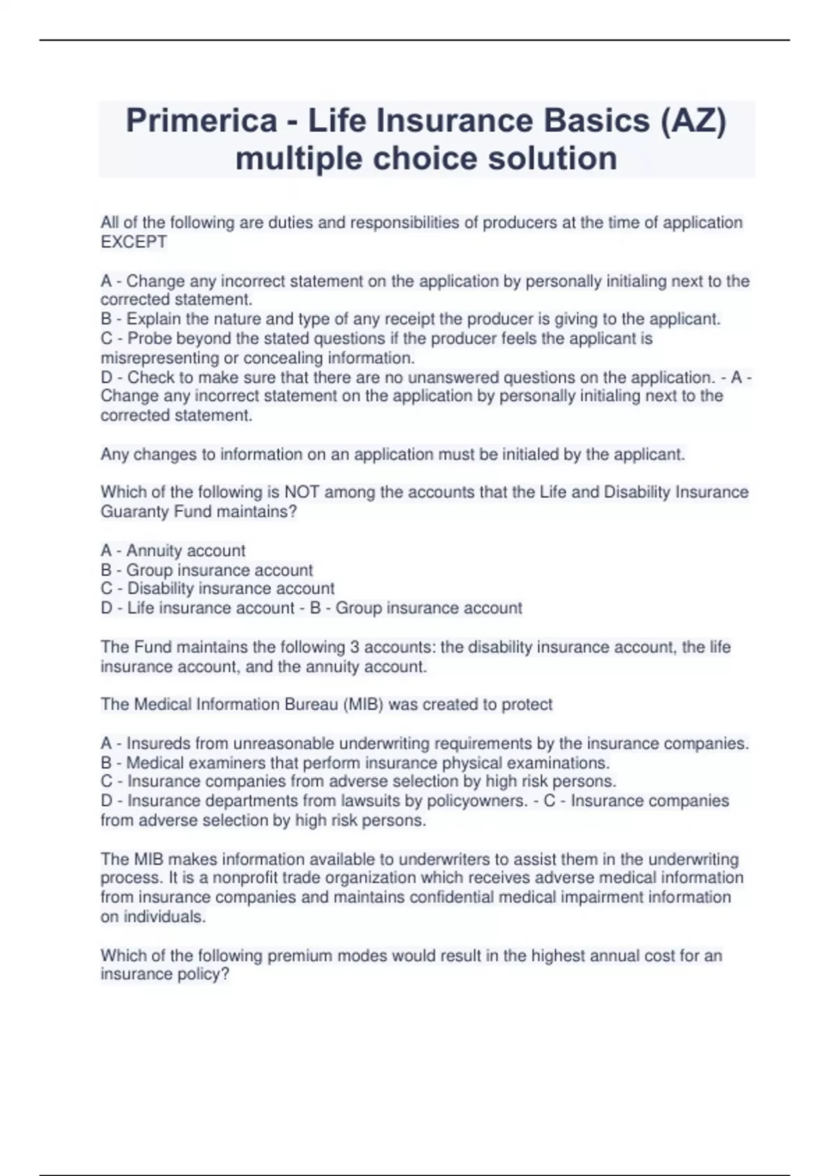 Primerica - Life Insurance Basics (AZ) multiple choice solution All of the following are duties and responsibilities of producers at the time of application EXCEPT A - Change any incorrect statement on the application by personally initialing next to the corrected statement. B - Explain the nature and type of any receipt the producer is giving to the applicant. C - Probe beyond the stated questions if the producer feels the applicant is misrepresenting or concealing information. D - Check to make sure that there are no unanswered questions on the application. - A - Change any incorrect statement on the application by personally initialing next to the corrected statement. Any changes to information on an application must be initialed by the applicant. Which of the following is NOT among the accounts that the Life and Disability Insurance Guaranty Fund maintains? A - Annuity account B - Group insurance account C - Disability insurance account D - Life insurance account - B - Group insurance account The Fund maintains the following 3 accounts: the disability insurance account, the life insurance account, and the annuity account. The Medical Information Bureau (MIB) was created to protect A - Insureds from unreasonable underwriting requirements by the insurance companies. B - Medical examiners that perform insurance physical examinations. C - Insurance companies from adverse selection by high risk persons. D - Insurance departments from lawsuits by policyowners. - C - Insurance companies from adverse selection by high risk persons. The MIB makes information available to underwriters to assist them in the underwriting process. It is a nonprofit trade organization which receives adverse medical information from insurance companies and maintains confidential medical impairment information on individuals. Which of the following premium modes would result in the highest annual cost for an insurance policy? A - Monthly B - Quarterly C - Semi-annual D - Annual - A - Monthly If the policyowner chooses to pay the premium more frequently than annually, there will be an additional charge (loading) because the company will not have the premium to invest for a full year, and the company will have additional expenses in billing the premium. Based on Human Life Value Approach, which of the following is NOT used to calculate an individual's life value? A - Effect of inflation on income over time. B - Predicted needs of the family after the insured's death. C - Insured's current and future income. D - Insured's annual expenses. - B - Predicted needs of the family after the insured's death. The Human Life Value Approach to determining the value of an individual's life requires the calculation of probable future earnings of the insured, which involves wages, expenses, inflation, amount of time until retirement, and the time value of money. Predicted needs of the family after the insured's death are used in the needs approach. Which is generally true regarding insureds who have been classified as preferred risks? A - They can decide when to pay their monthly premiums. B - They keep a higher percentage of any interest earned on their policies. C - Their premiums are lower. D - They can borrow higher amounts off of their policies. - C - Their premiums are lower. The preferred risk classification indicates that an insured is in excellent physical condition and employs healthy lifestyles and habits. These individuals qualify for lower premiums than those in the other categories.