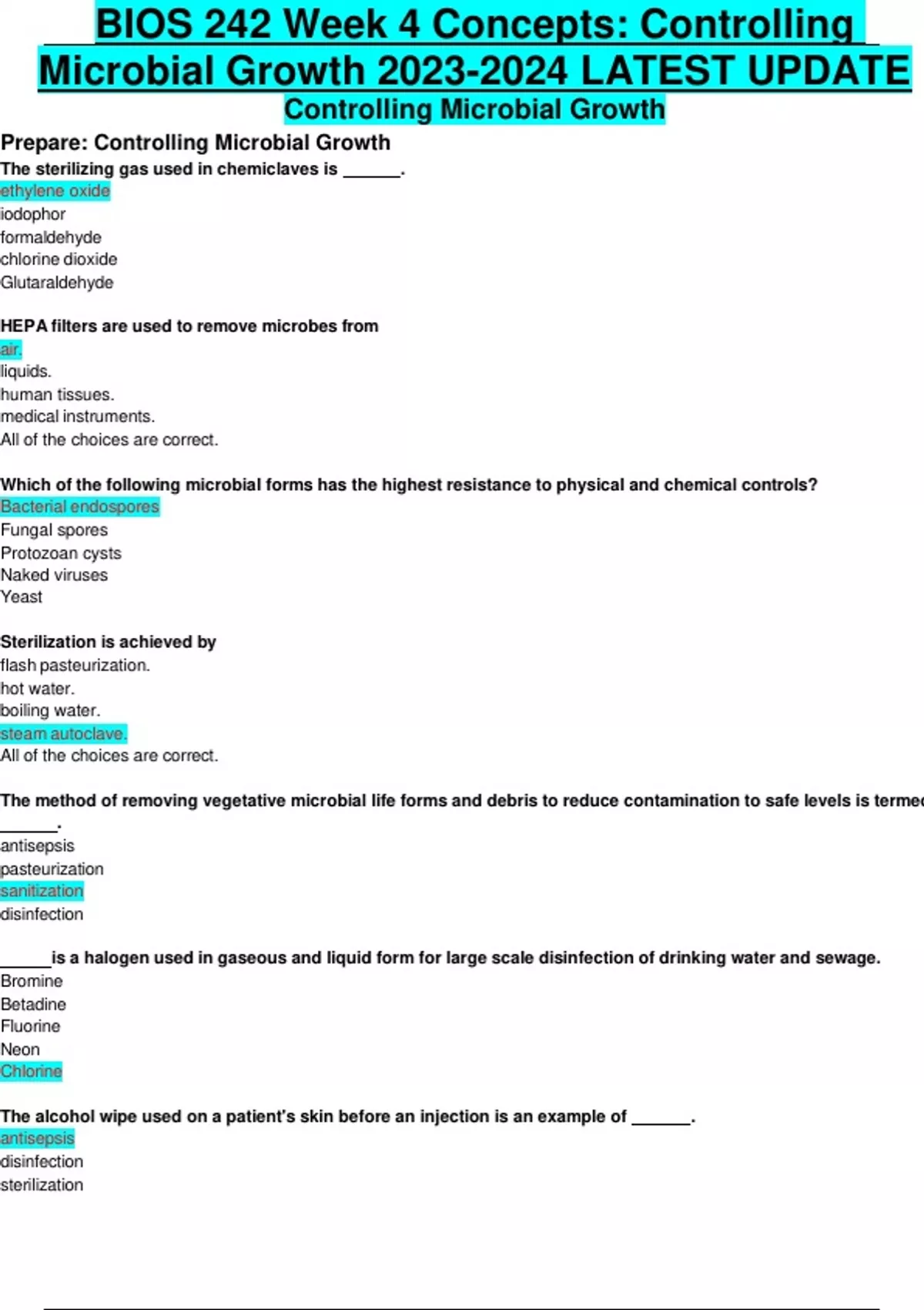 BIOS 242 Week 4 Concepts: Controlling Microbial Growth LATEST UPDATE Controlling Microbial Growth Prepare: Controlling Microbial Growth The sterilizing gas used in chemiclaves is . ethylene oxide iodophor formaldehyde chlorine dioxide Glutaraldehyde HEPA filters are used to remove microbes from air. liquids. human tissues. medical instruments. All of the choices are correct. Which of the following microbial forms has the highest resistance to physical and chemical controls? Bacterial endospores Fungal spores Protozoan cysts Naked viruses Yeast Sterilization is achieved by flash pasteurization. hot water. boiling water. steam autoclave. All of the choices are correct
