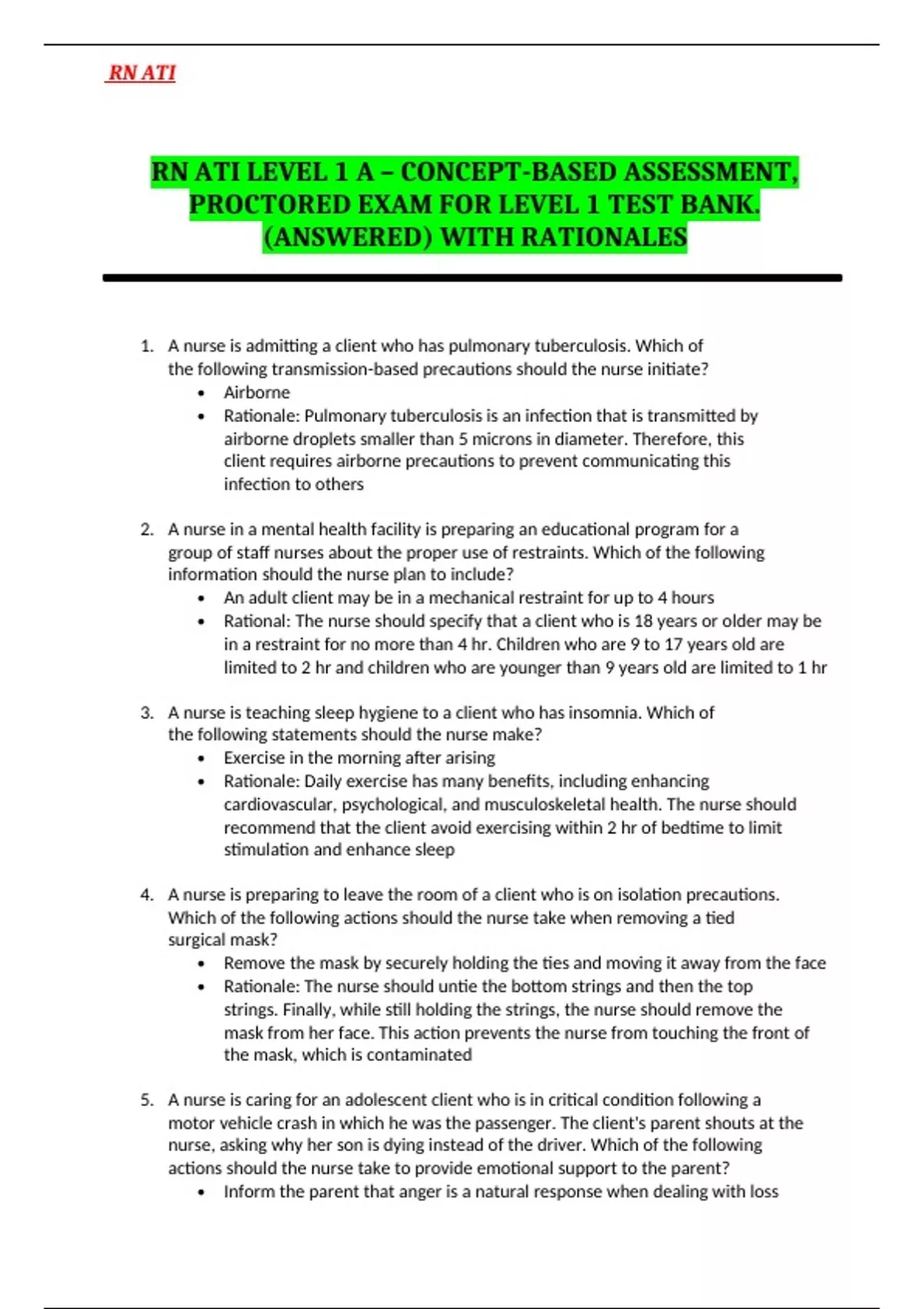 RN ATI LEVEL 1 A & B – CONCEPT - BASED ASSESSMENT, PROCTORED EXAM FOR LEVEL 1 A & B TEST BANK. 1. A nurse is admitting a client who has pulmonary tuberculosis. Which of the following transmission-based precautions should the nurse initiate? • Airborne • Rationale: Pulmonary tuberculosis is an infection that is transmitted by airborne droplets smaller than 5 microns in diameter. Therefore, this client requires airborne precautions to prevent communicating this infection to others 2. A nurse in a mental health facility is preparing an educational program for a group of staff nurses about the proper use of restraints. Which of the following information should the nurse plan to include? • An adult client may be in a mechanical restraint for up to 4 hours • Rational: The nurse should specify that a client who is 18 years or older may be in a restraint for no more than 4 hr. Children who are 9 to 17 years old are limited to 2 hr and children who are younger than 9 years old are limited to 1 hr A nurse is submitting a dietary request for a client who devoutly follows Mormon dietary practices. The nurse should ask the client if they would like which of the following foods or beverages excluded from meals? A. Bacon B. Coffee C. Shrimp D. Milk - B. Coffee A nurse is assessing a client who has a rash on their hands and forearms after working in a garden. The nurse should identify that which of the following findings indicates contact dermatitis?