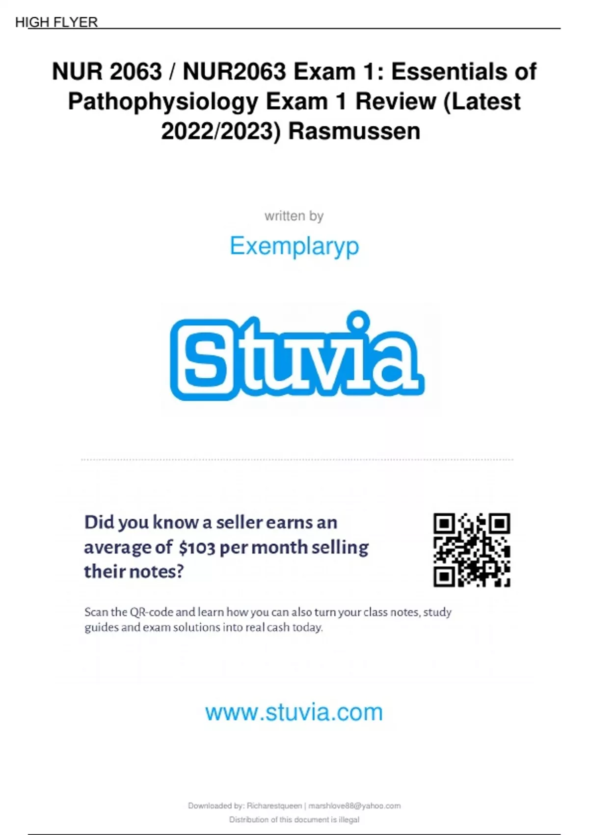 what are the treatments for frostbite in the ED? - Warm saline, immerse hands/feet in warm water, elevate affected limbs, have them rub their hands together Priority treatment for pt with a heat stroke - Move them out of the sun, into shade First priority assessment - Airway Process called for sorting patients - Triage Pt with a heat stroke starts to shiver. Why is this this bad? - Raises their temp.; give them meds Pt has an increased temp., what will we tell the UAP to do? - Strip them down/remove clothing 2nd degree frost bite looks like? - Milky fluid, red w/ blisters S - The Marketplace to Buy and Sell your Study Material Downloaded by: helena_zavala | Distribution of this document is illegal This study source was downloaded by from CourseH on :03:08 GMT -05:00 HIGH FLYER S - The Marketplace to Buy and Sell your Study Material Pt w/ heat stroke--what characteristics would we see in the pt? - Tachycardia, irregular pulse patter, visual disturbance, dec. urine output Pt being treated for hypothermia & is on a heart monitor. What is the reason that the pt could have arrhythmias? - Lactic acid shunted Pt sustained a blunt trauma to the chest, sign that the pt has a pneumothorax? - Diminished breath sounds Low pressure alarms on the ventilator, what do we think happened/what do we do? - It disconnected; ventilate the pt manually Pt w/ rib fracture, how would they present? - Pain on inspiration Most distinctive sign of flailed chest? - Paradoxical chest movement Pt has a high-pressure alarm on the ventilator & absence of breath sounds on the right lower lobe. what do they have? - Pneumothorax