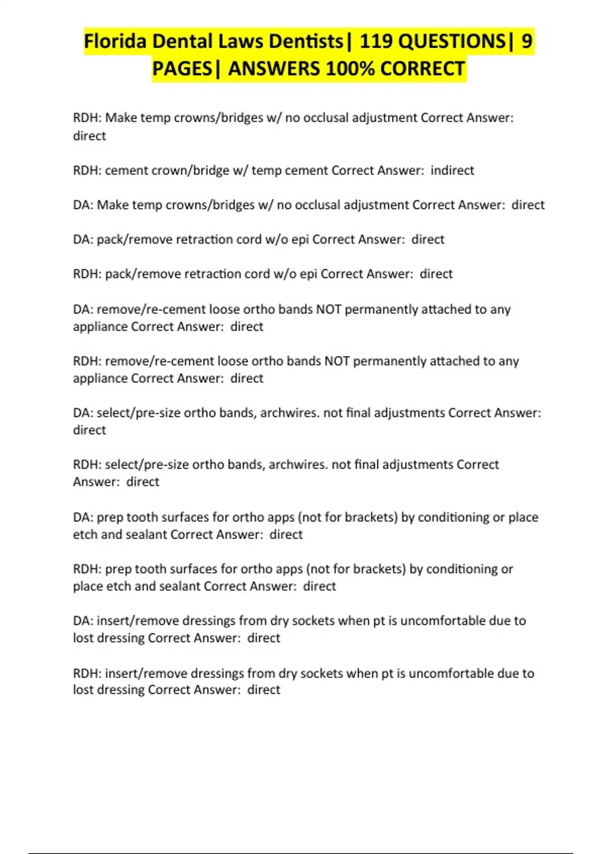 Florida Dental Laws Dentists| 119 QUESTIONS| 9 PAGES| ANSWERS 100% CORRECT