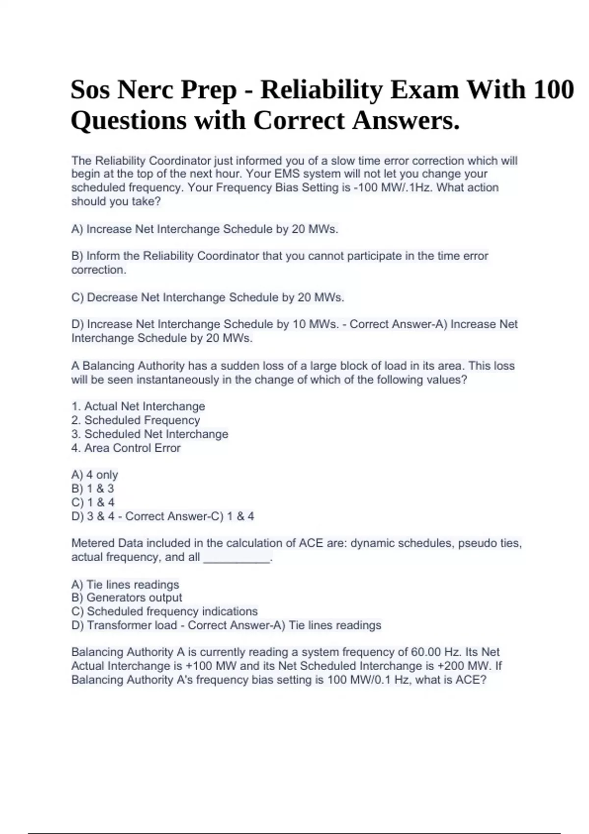 Sos Nerc Prep - Reliability Exam With 100 Questions with Correct Answers. The Reliability Coordinator just informed you of a slow time error correction which will begin at the top of the next hour. Your EMS system will not let you change your scheduled frequency. Your Frequency Bias Setting is -100 MW/.1Hz. What action should you take? A) Increase Net Interchange Schedule by 20 MWs. B) Inform the Reliability Coordinator that you cannot participate in the time error correction. C) Decrease Net Interchange Schedule by 20 MWs. D) Increase Net Interchange Schedule by 10 MWs. - Correct Answer-A) Increase Net Interchange Schedule by 20 MWs. A Balancing Authority has a sudden loss of a large block of load in its area. This loss will be seen instantaneously in the change of which of the following values? 1. Actual Net Interchange 2. Scheduled Frequency 3. Scheduled Net Interchange 4. Area Control Error A) 4 only B) 1 & 3 C) 1 & 4 D) 3 & 4 - Correct Answer-C) 1 & 4 Metered Data included in the calculation of ACE are: dynamic schedules, pseudo ties, actual frequency, and all __________. A) Tie lines readings B) Generators output C) Scheduled frequency indications D) Transformer load - Correct Answer-A) Tie lines readings Balancing Authority A is currently reading a system frequency of 60.00 Hz. Its Net Actual Interchange is +100 MW and its Net Scheduled Interchange is +200 MW. If Balancing Authority A's frequency bias setting is 100 MW/0.1 Hz, what is ACE? Sos Nerc Prep - Reliability Exam With 100 Questions with Correct Answers. A) -100 B) 0 C) 10 D) 100 - Correct Answer-A) -100 A Balancing Authority has a Net Interchange Schedule of -250 MWs from 1200 to 1600 on a summer day. The Net Interchange Actual for those same hours respectively were - 230 MW, -275 MW, -250 MW and -270 MW. What was the Balancing Authority's Inadvertent Interchange for the 4-hour period? A) 6 MWs out B) 25 MWs in C) 25 MWs out D) 6 MWs in - Correct Answer-B) 25 MWs in For the ACE equation to work properly, dynamic schedules, pseudo ties, frequency, and all ________________ must be metered. A) Generation B) Communications C) Transformers D) Tie lines - Correct Answer-D) Tie lines If the frequency bias setting is set to a less negative value than the frequency response of a Balancing Authority and a frequency increase is caused by a sudden loss of load in an external balancing area, what will be the result? A) The ACE will be zero and will take no AGC action B) The ACE will be a negative value and AGC will increase generation C) The ACE will be a positive value and AGC will lower generation D)This will not affect the ACE - Correct Answer-B) The ACE will be a negative value and AGC will increase generation If the frequency bias setting is less negative than the frequency response of a Balancing Authority and a frequency decline is caused by a sudden loss of generation in an external balancing area, what will be the result? A) The ACE will be a negative value and AGC will increase generation. B) This will not affect the ACE. C) The ACE will be a positive value and AGC will lower generation. D) The ACE will be zero and will take no AGC action. - Correct Answer-C) The ACE will be a positive value and AGC will lower generation. It is the responsibility of which entity/entities to develop, maintain, and implement load shedding plans? A) Transmission Operators and Balancing Authorities B) Reliability Coordinator C) Load Serving Entities D) Balancing Authority - Correct Answer-A) Transmission Operators and Balancing Authorities A Transmission line is loaded 25% above its SOL. A parallel line is out for routine maintenance and can be placed in service in 10 minutes. What is the first step the Operator should take to reduce the line loading? A)Shed load at the downstream bus. B) Open the line. C) Re-Dispatch Generation. D) Initiate the restoration of the parallel line. - Correct Answer-D) Initiate the restoration of the parallel line. As a Transmission Operator, you realize that the voltage level is starting to decline in the North West part of the system. Which of the following devices should you, as a Transmission Operator, be able to operate, and/or have another entity operate to raise the voltage level back to normal in the North West part of the system? A) Transformer Underload Tap Changers B) Shunt Capacitor Banks C) Generator Reactive Output D) All answers are correct - Correct Answer-D) All answers are correct Voltage reduction for load relief should be made on the __________. A) Distribution system B) Entire Interconnection simultaneously C) Tie-lines with other Balancing Authority Areas D) Transmission System - Correct Answer-A) Distribution system Under Frequency Load Shedding (UFLS) is to stabilize the imbalance between generation and load that has been created by a system disturbance. This is accomplished by ____________. A) Tripping generation first B) Voltage reduction on the distribution system. C) Shedding all load to arrest frequency D) Shedding load prior to generation tripping - Correct Answer-D) Shedding load prior to generation tripping Failure to meet the DCS criteria of recovery within 15 minutes results in which consequence for a specified time period for the Balancing Authority's failure to recover? A) Increased Contingency Reserve requirements B) Decertification as a Balancing Authority C) Not allowed to supply regulation services D) Expulsion from the Reserve Sharing Group - Correct Answer-A) Increased Contingency Reserve requirements A Balancing Authority foresees or is experiencing conditions where all available resources are committed to meet firm load, and firm transactions. The BA should request which level of the Energy Emergency Alerts? A) Energy Emergency Alert Level 2 B) Energy Emergency Alert Level 4 C) Energy Emergency Alert Level 1 D) Energy Emergency Alert Level 3 - Correct Answer-C) Energy Emergency Alert Level 1 Preparations are being made to tie two islands together during restoration. Island
