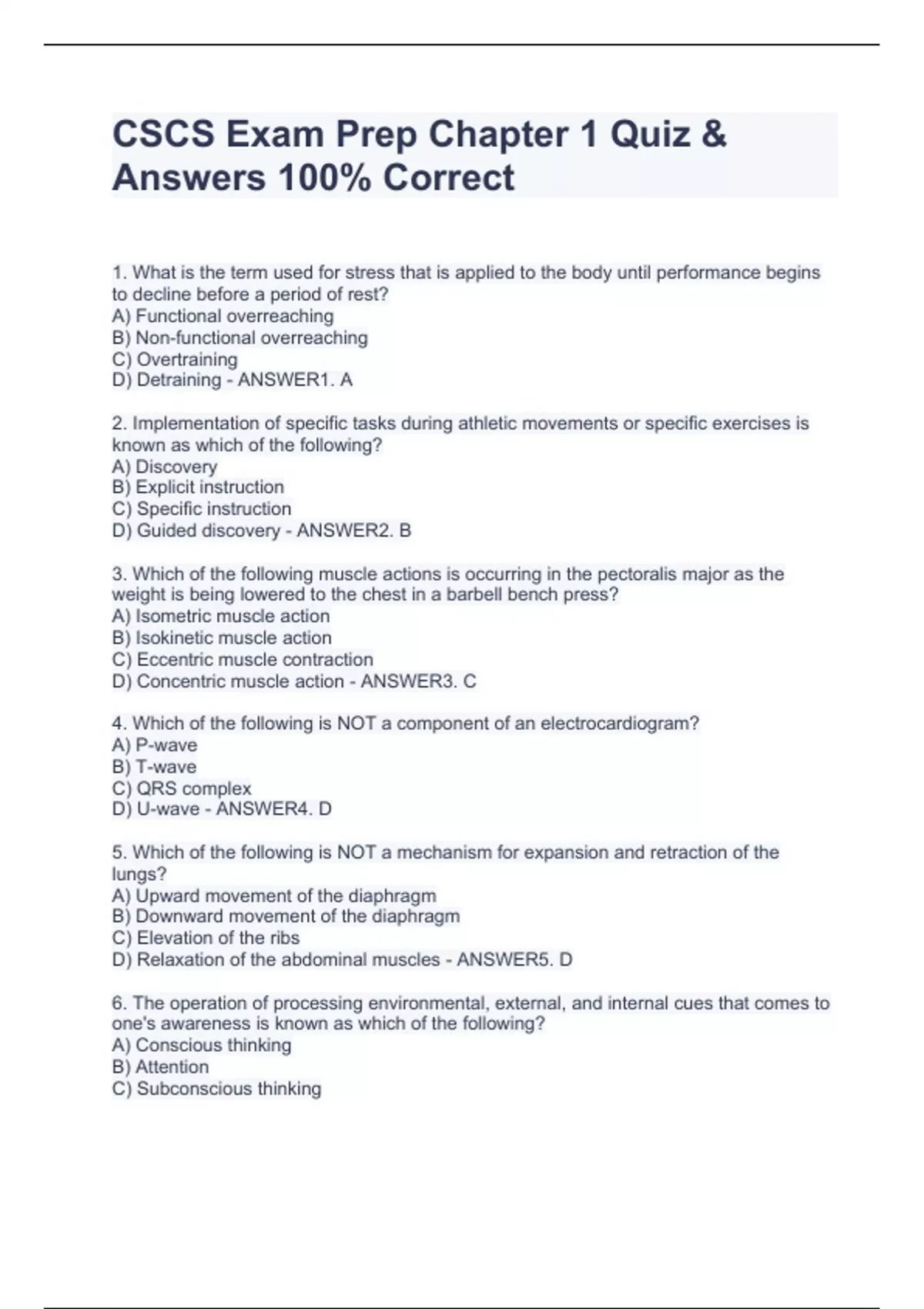 CSCS Exam Prep Chapter 1 Quiz & Answers 100% CorrectCSCS Exam Prep Chapter 1 Quiz & Answers 100% CorrectCSCS Exam Prep Chapter 1 Quiz & Answers 100% CorrectCSCS Exam Prep Chapter 1 Quiz & Answers 100% Correct 1. What is the term used for stress that is applied to the body until performance begins to decline before a period of rest? A) Functional overreaching B) Non-functional overreaching C) Overtraining D) Detraining - ANSWER1. A 2. Implementation of specific tasks during athletic movements or specific exercises is known as which of the following? A) Discovery B) Explicit instruction C) Specific instruction D) Guided discovery - ANSWER2. B 3. Which of the following muscle actions is occurring in the pectoralis major as the weight is being lowered to the chest in a barbell bench press? A) Isometric muscle action B) Isokinetic muscle action C) Eccentric muscle contraction D) Concentric muscle action - ANSWER3. C 4. Which of the following is NOT a component of an electrocardiogram? A) P-wave B) T-wave C) QRS complex D) U-wave - ANSWER4. D 5. Which of the following is NOT a mechanism for expansion and retraction of the lungs? A) Upward movement of the diaphragm B) Downward movement of the diaphragm C) Elevation of the ribs D) Relaxation of the abdominal muscles - ANSWER5. D 6. The operation of processing environmental, external, and internal cues that comes to one's awareness is known as which of the following? A) Conscious thinking B) Attention C) Subconscious thinking