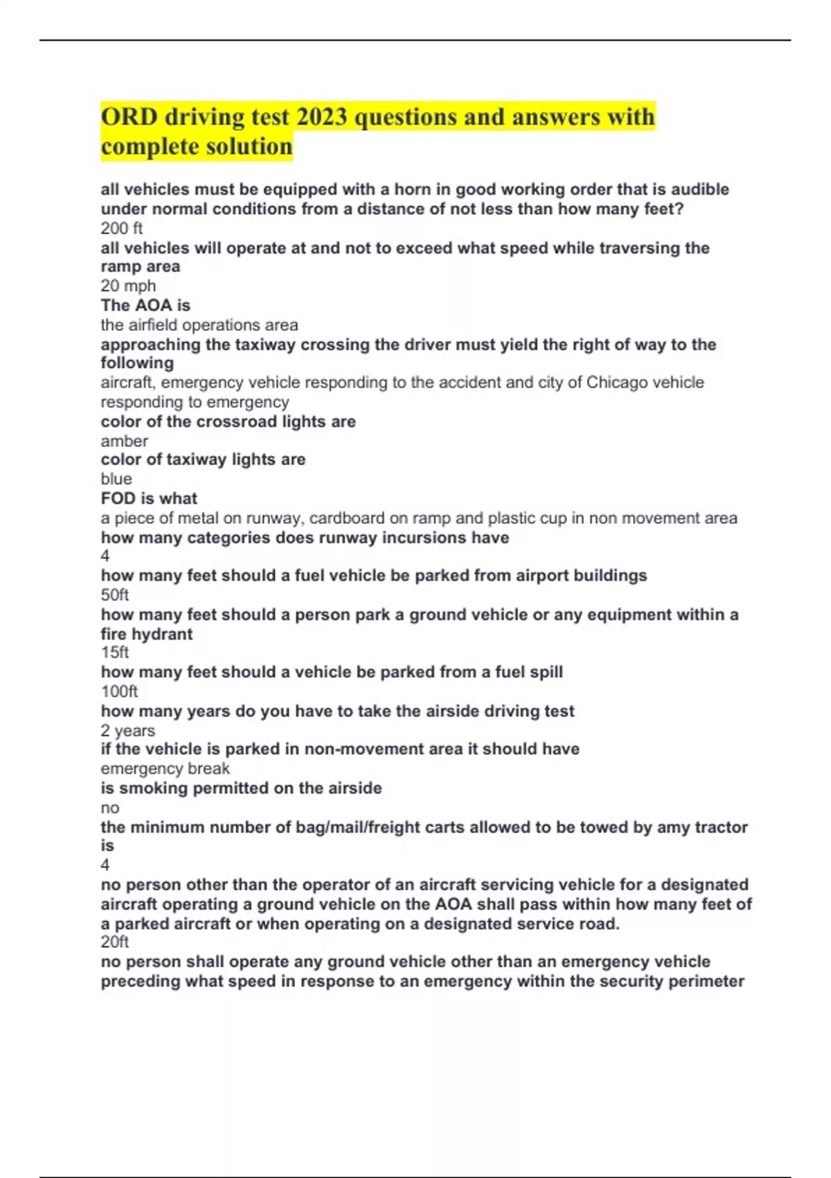 ORD driving test 2023 questions and answers with complete solution all vehicles must be equipped with a horn in good working order that is audible under normal conditions from a distance of not less than how many feet? 200 ft all vehicles will operate at and not to exceed what speed while traversing the ramp area 20 mph The AOA is the airfield operations area approaching the taxiway crossing the driver must yield the right of way to the following aircraft, emergency vehicle responding to the accident and city of Chicago vehicle responding to emergency color of the crossroad lights are amber color of taxiway lights are blue FOD is what a piece of metal on runway, cardboard on ramp and plastic cup in non movement area how many categories does runway incursions have 4 how many feet should a fuel vehicle be parked from airport buildings 50ft how many feet should a person park a ground vehicle or any equipment within a fire hydrant 15ft how many feet should a vehicle be parked from a fuel spill 100ft how many years do you ha