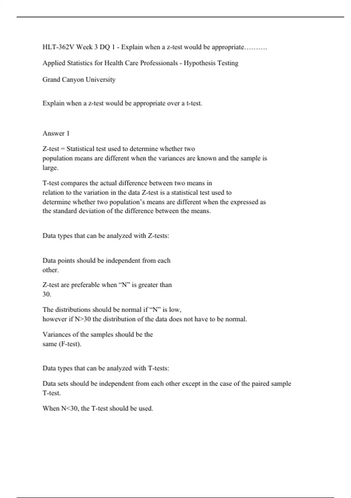 HLT-362V Week 3 DQ 1 - Explain when a z-test would be appropriate………. Applied Statistics for Health Care Professionals - Hypothesis Testing Grand Canyon University Explain when a z-test would be appropriate over a t-test. Answer 1 Z-test = Statistical test used to determine whether two population means are different when the variances are known and the sample is large. T-test compares the actual difference between two means in relation to the variation in the data Z-test is a statistical test used to determine whether two population’s means are different when the expressed as the standard deviation of the difference between the means. Data types that can be analyzed with Z-tests: Data points should be independent from each