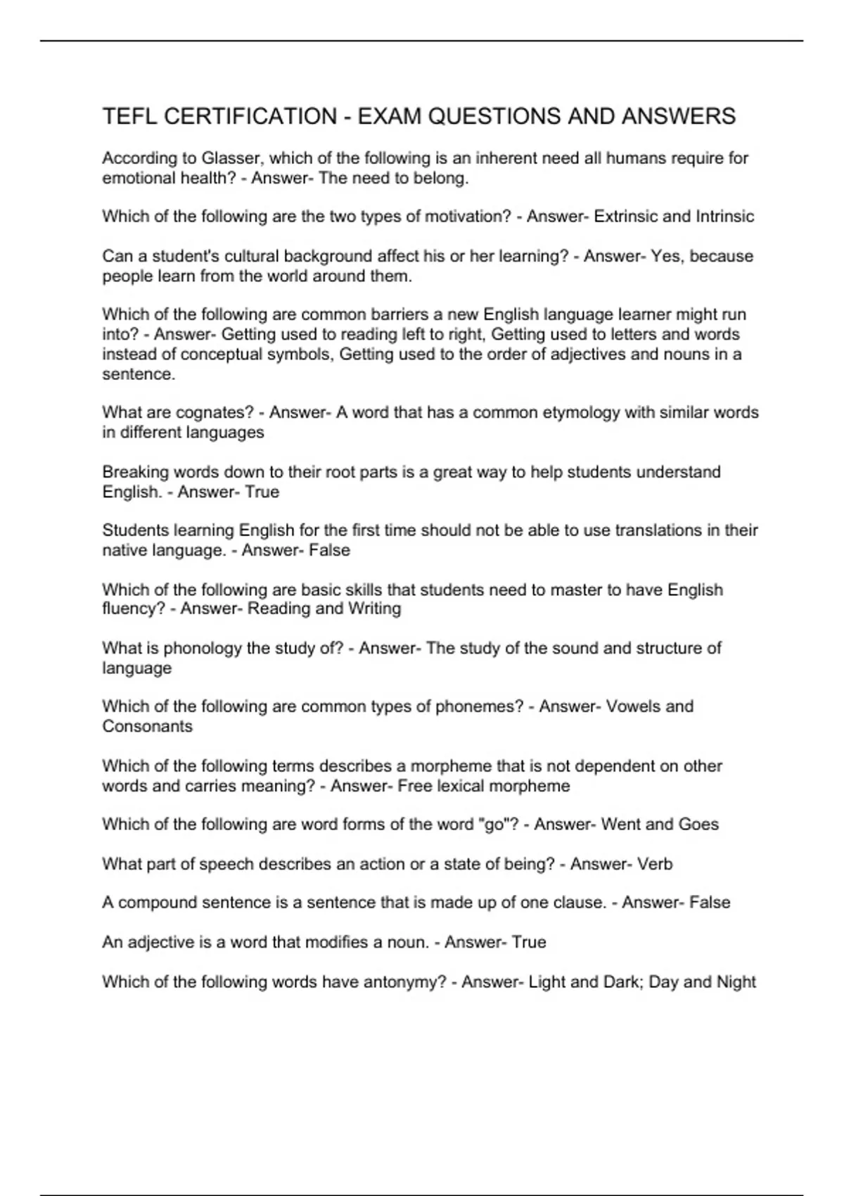 TEFL CERTIFICATION - EXAM QUESTIONS AND ANSWERS