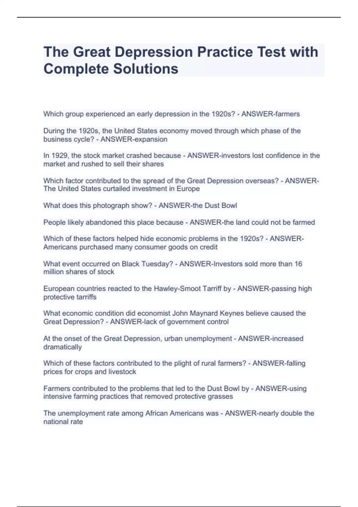 The Great Depression Practice Test with Complete SolutionsThe Great Depression Practice Test with Complete SolutionsThe Great Depression Practice Test with Complete SolutionsThe Great Depression Practice Test with Complete Solutions Which group experienced an early depression in the 1920s? - ANSWER-farmers During the 1920s, the United States economy moved through which phase of the business cycle? - ANSWER-expansion