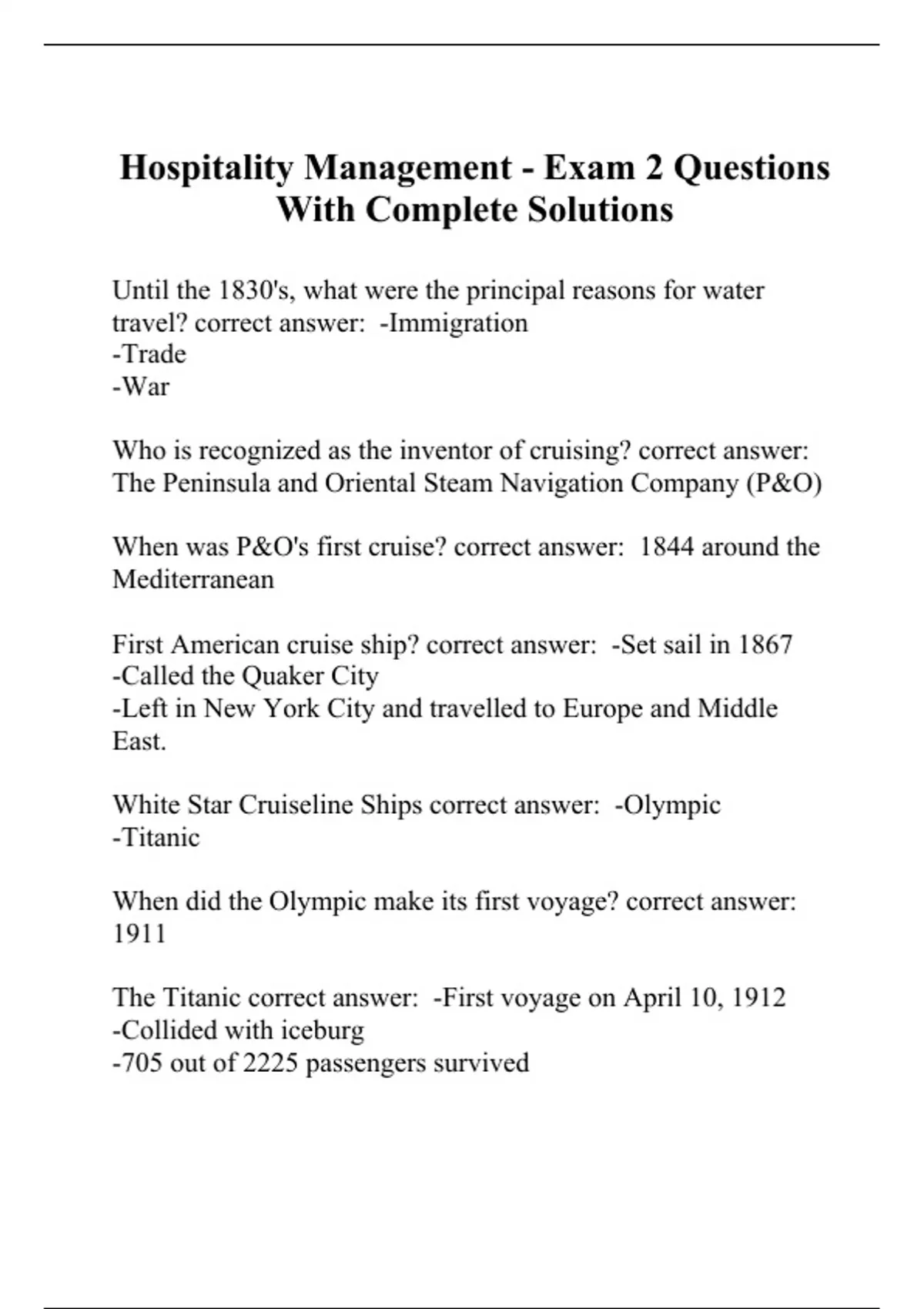 Until the 1830's, what were the principal reasons for water travel? correct answer: -Immigration -Trade -War Who is recognized as the inventor of cruising? correct answer: The Peninsula and Oriental Steam Navigation Company (P&O) When was P&O's first cruise? correct answer: 1844 around the Mediterranean First American cruise ship? correct answer: -Set sail in 1867 -Called the Quaker City -Left in New York City and travelled to Europe and Middle East. White Star Cruiseline Ships correct answer: -Olympic -Titanic When did the Olympic make its first voyage? correct answer: 1911 The Titanic correct answer: -First voyage on April 10, 1912 -Collided with iceburg -705 out of 2225 passengers survived What came out of the Titanic's sinking? correct answer: The realization of the need for increased safety regulations, particularly lifeboats. How did WWI change the ship travel industry? correct answer: -U.S. changes in immigration policies -New attraction that Europe held for Americans -Cruising became fashionable Air-Cruise Packages correct answer: Packages that include air and cruise travel in one price. What started air-cruise packages? correct answer: When aviation became popular, cruise lines started losing business to them, but then they came together. They used airplanes to get passengers to their ports. The cruise business is a ______ industry. correct answer: 36.9 billion dollar The cruising industry carries almost _________ passengers. correct answer: 25 million Cruise lines are spending billions on cruise ships to: correct answer: Increase capacity Top Three Players in the cruise industry: correct answer: -Carnival Cruise Lines -Royal Caribbean Cruises -Norwegian Cruise Line Most financially successful cruise line: correct answer: Carnival Cruise Lines What is Carnival Cruise Lines largest source of income aside from the fair itself? correct answer: Beverage services with casinos at a close second. Carnival Corporation includes: correct answer: -Carnival Cruise Lines -Holland America Line -AIDA Cruises -P&O Cruises UK -P&O Cruises Australia -Cunard Line -Princess Cruises -Seaborn Cruise Line -Costa Cruises Second Largest cruise line: correct answer: Royal Caribbean Cruises Royal Caribbean operates under: correct answer: Royal Caribbean International and Celebrity Cruises Royal Caribbean fleet consists of: correct answer: -48 ships -280 destinations Third largest cruise line: co