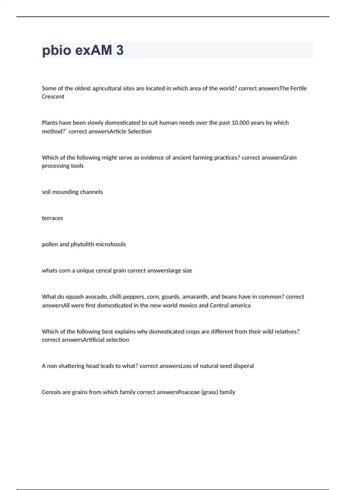 Some of the oldest agricultural sites are located in which area of the world? correct answersThe Fertile Crescent Plants have been slowly domesticated to suit human needs over the past 10,000 years by which method?` correct answersArticle Selection Which of the following might serve as evidence of ancient farming practices? correct answersGrain processing tools soil mounding channels terraces pollen and phytolith microfossils whats corn a unique cereal grain correct answerslarge size What do squash avocado, chilli peppers, corn, gourds, amaranth, and beans have in common? correct answersAll were first domesticated in the new world mexico and Central america Which of the following best explains why domesticated crops are different from their wild relatives? correct answersArtificial selection A non shattering head leads to what? correct answersLoss of natural seed disperal Cereals are grains from which family correct answersPoaceae (grass) family