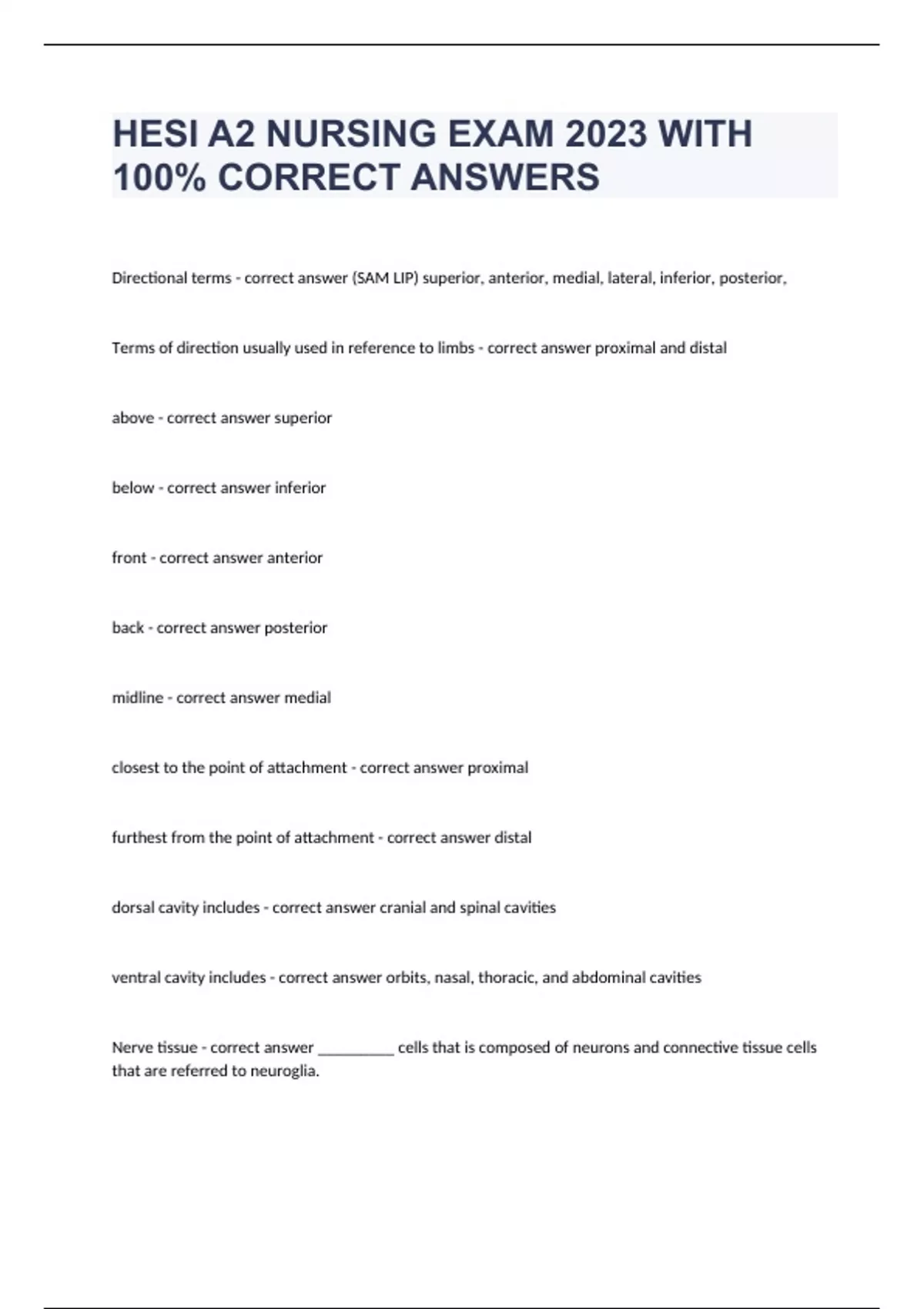 Directional terms - correct answer (SAM LIP) superior, anterior, medial, lateral, inferior, posterior, Terms of direction usually used in reference to limbs - correct answer proximal and distal above - correct answer superior below - correct answer inferior front - correct answer anterior back - correct answer posterior midline - correct answer medial closest to the point of attachment - correct answer proximal furthest from the point of attachment - correct answer distal dorsal cavity includes - correct answer cranial and spinal cavities ventral cavity includes - correct answer orbits, nasal, thoracic, and abdominal cavities Nerve tissue - correct answer _________ cells that is composed of neurons and connective tissue cells that are referred to neuroglia. What are the