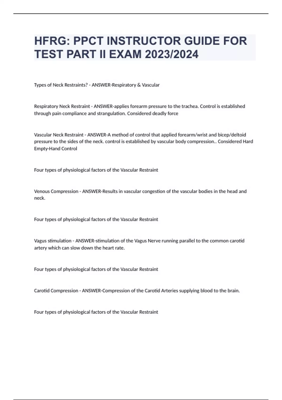 HFRG: PPCT INSTRUCTOR GUIDE FOR TEST PART II EXAM 2023/2024 Types of Neck Restraints? - ANSWER-Respiratory & Vascular Respiratory Neck Restraint - ANSWER-applies forearm pressure to the trachea. Control is established through pain compliance and strangulation. Considered deadly force Vascular Neck Restraint - ANSWER-A method of control that applied forearm/wrist and bicep/deltoid pressure to the sides of the neck. control is established by vascular body compression.. Considered Hard Empty-Hand Control Four types of physiological factors of the Vascular Restraint Venous Compression - ANSWER-Results in vascular congestion of the vascular bodies in the head and neck. Four types of physiological factors of the Vascular Restraint Vagus stimulation - ANSWER-stimulation of the Vagus Nerve running parallel to the common carotid artery which can slow down the heart rate. Four types of physiological factors of the Vascular Restraint Carotid Compression - ANSWER-Compression of the Carotid Arteries supplying blood to the brain. Four types of physiological factors of the Vascular Restraint