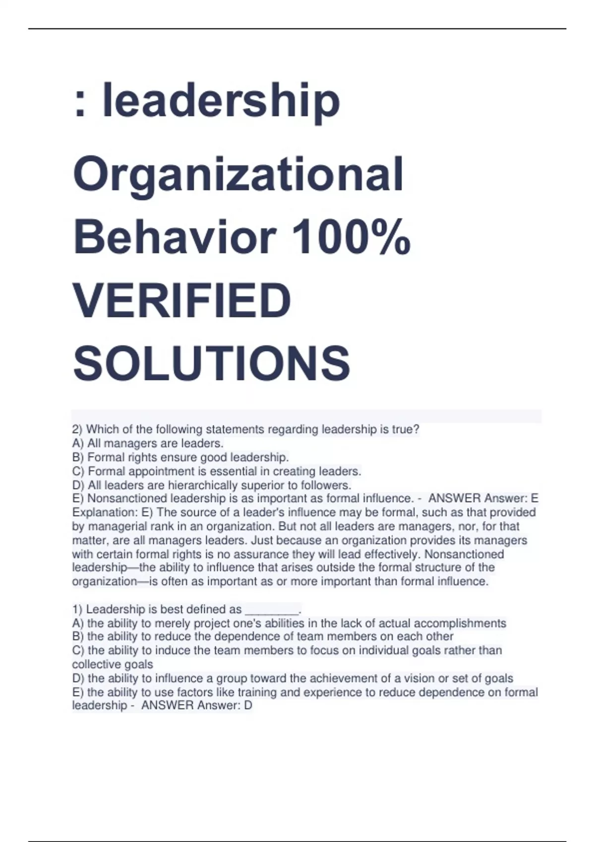 leadership Organizational Behavior 100% VERIFIED SOLUTIONS