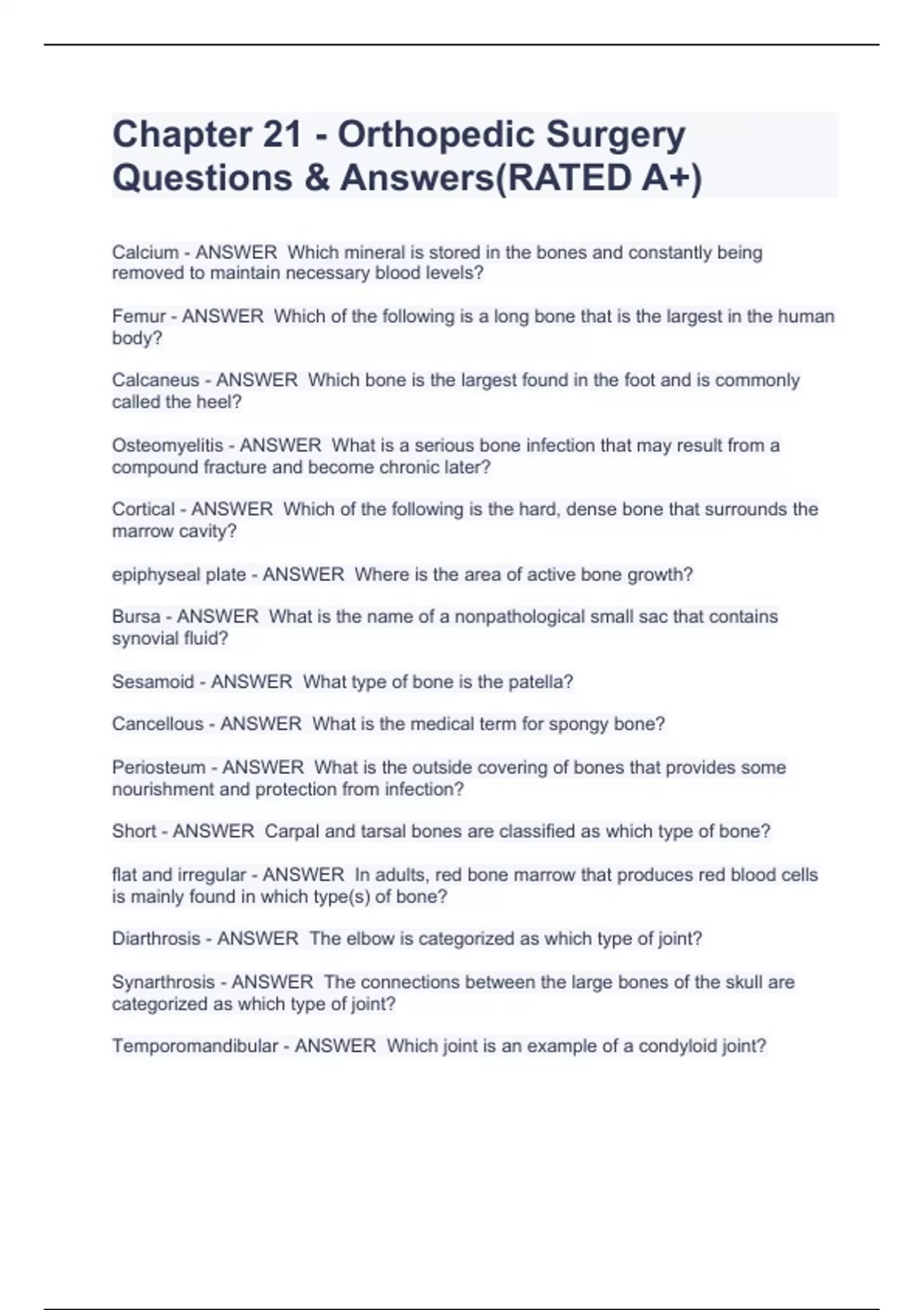 Calcium - ANSWER Which mineral is stored in the bones and constantly being removed to maintain necessary blood levels? Femur - ANSWER Which of the following is a long bone that is the largest in the human body? Calcaneus - ANSWER Which bone is the largest found in the foot and is commonly called the heel? Osteomyelitis - ANSWER What is a serious bone infection that may result from a compound fracture and become chronic later? Cortical - ANSWER Which of the following is the hard, dense bone that surrounds the marrow cavity? epiphyseal plate - ANSWER Where is the area of active bone growth? Bursa - ANSWER What is the name of a nonpathological small sac that contains synovial fluid? Sesamoid - ANSWER What type of bone is the patella? Cancellous - ANSWER What is the medical term for spongy bone? Periosteum - ANSWER What is the outside covering of bones that provides some nourishment and protection from infection? Short - ANSWER Carpal and tarsal bones are classified as which type of bone? flat and irregular - ANSWER In adults, red bone marrow that produces red blood cells is mainly found in which type(s) of bone? Diarthrosis - ANSWER The elbow is categorized as which type of joint? Synarthrosis - ANSWER The connections between the large bones of the skull are categorized as which type of joint? Temporomandibular - ANSWER Which joint is an example of a condyloid joint? Chapter 21 - Orthopedic Surgery Questions & Answers(RATED A+)