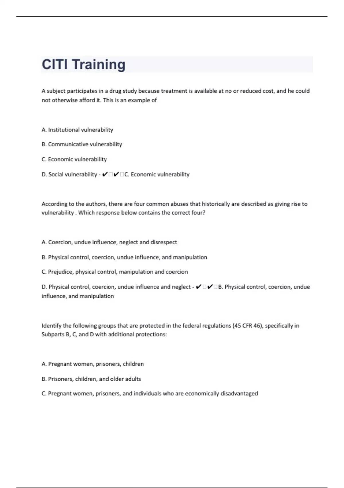 A subject participates in a drug study because treatment is available at no or reduced cost, and he could not otherwise afford it. This is an example of A. Institutional vulnerability B. Communicative vulnerability C. Economic vulnerability D. Social vulnerability - ️️C. Economic vulnerability According to the authors, there are four common abuses that historically are described as giving rise to vulnerability . Which response below contains the correct four? A. Coercion, undue influence, neglect and disrespect B. Physical control, coercion, undue influence, and manipulation C. Prejudice, physical control, manipulation and coercion D. Physical control, coercion, undue influence and neglect - ️️B. Physical control, coercion, undue influence, and manipulation Identify the following groups that are protected in the federal regulations (45 CFR 46), specifically in Subparts B, C, and D with additional protections: A. Pregnant women, prisoners, children B. Prisoners, children, and older adults C. Pregnant women, prisoners, and individuals who are economically disadvantaged D. Children, prisoners, and individuals who are critically ill - ️️A. Pregnant women, prisoners, children