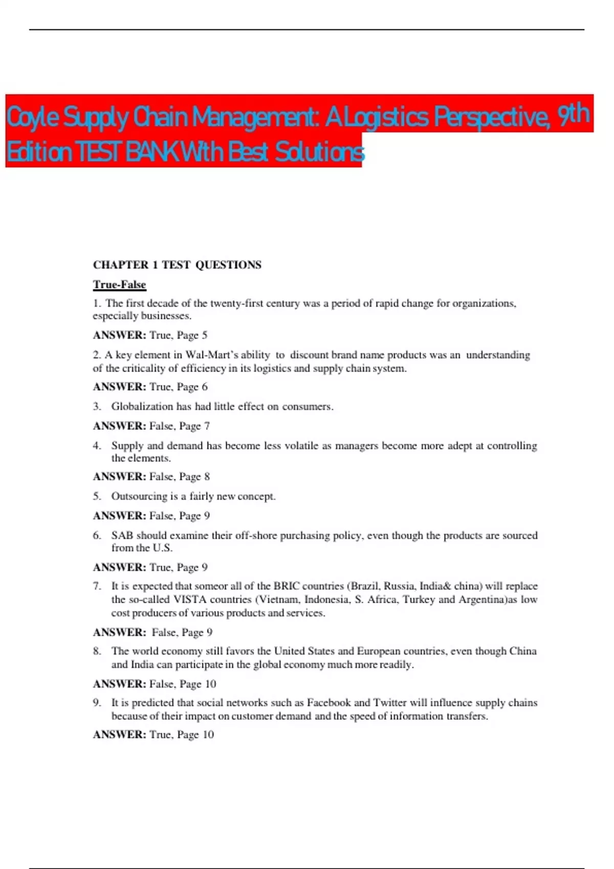 Coyle Supply Chain Management: A Logistics Perspective, 9th Edition TEST BANK With Best Solutions CHAPTER 1 TEST QUESTIONS True-False 1. The first decade of the twenty-first century was a period of rapid change for organizations, especially businesses. ANSWER: True, Page 5 2. A key element in Wal-Mart’s ability to discount brand name products was an understanding of the criticality of efficiency in its logistics and supply chain system. ANSWER: True, Page 6 3. Globalization has had little effect on consumers. ANSWER: False, Page 7 4. Supply and demand has become less volatile as managers become more adept at controlling the elements. ANSWER: False, Page 8 5. Outsourcing is a fairly new concept. ANSWER: False, Page 9 6. SAB should examine their off-shore purchasing policy, even though the products are sourced from the U.S. ANSWER: True, Page 9 7. It is expected that someor all of the BRIC countries (Brazil, Russia, India& china) will replace the so-called VISTA countries (Vietnam, Indonesia, S. Africa, Turkey and Argentina)as low cost producers of various products and services. ANSWER: False, Page 9 8. The world economy still favors the United States and European countries, even though China and India can participate in the global economy much more readily. ANSWER: False, Page 10 9. It is predicted that social networks such as Facebook and Twitter will influence supply chains because of their impact on customer demand and the speed of information transfers. ANSWER: True, Page 10 10. The U.S. transportation system was deregulated in the 1930s and 1940s in response to economic conditions and World War 2 ANSWER: False, Page 12 11. Even though there are references to supply chain management in the 1980s, SCM did not capture the attention of senior-level management until the 1990s. ANSWER: True, Page 15 12. Supply chain managers no longer need to worry about suboptimization in light of today’s technology. ANSWER: False, Page 19