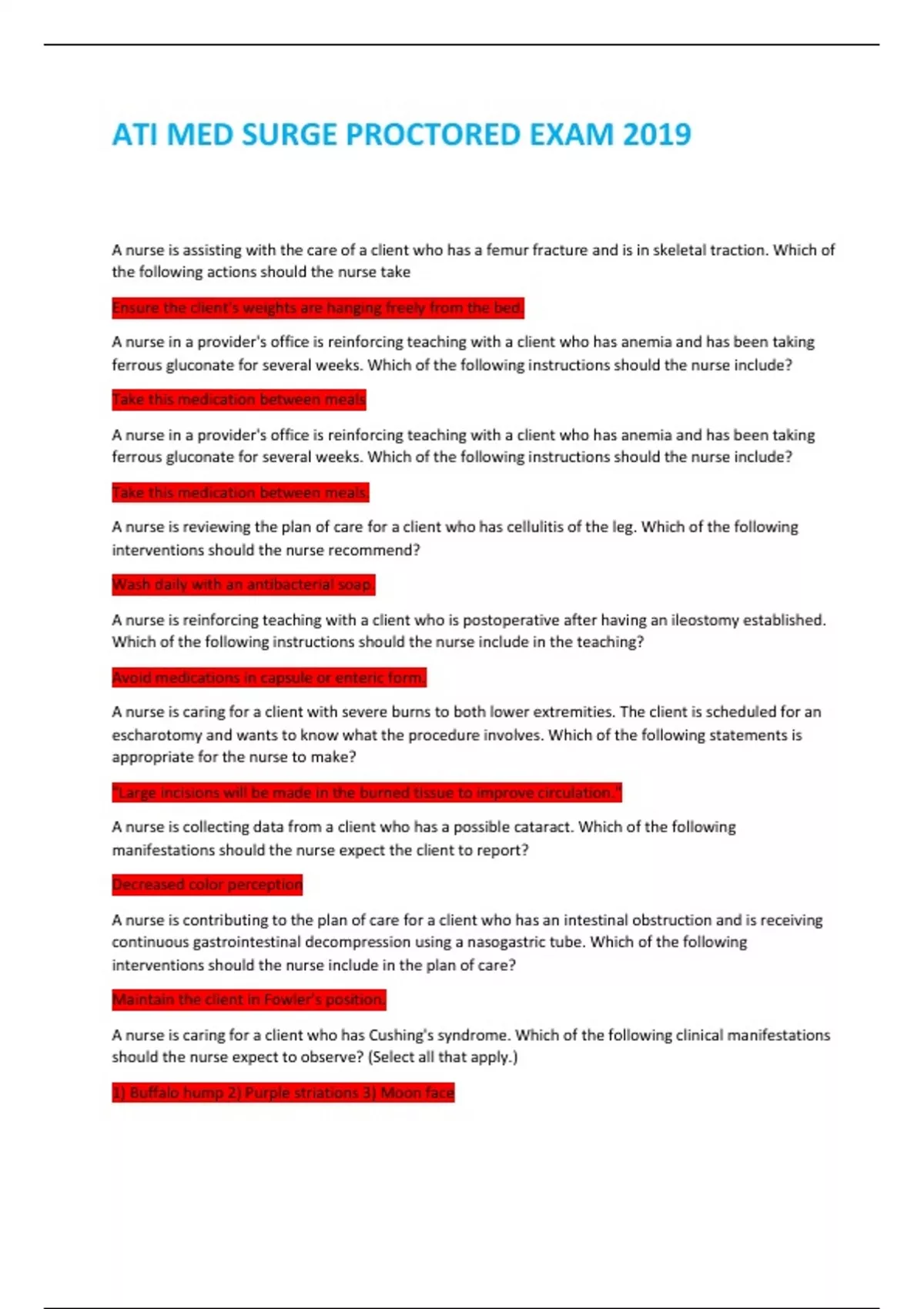 TI MED SURGE PROCTORED EXAM 2019 A nurse is assisting with the care of a client who has a femur fracture and is in skeletal traction. Which of the following actions should the nurse take Ensure the client's weights are hanging freely from the bed. A nurse in a provider's office is reinforcing teaching with a client who has anemia and has been taking ferrous gluconate for several weeks. Which of the following instructions should the nurse include? Take this medication between meals A nurse in a provider's office is reinforcing teaching with a client who has anemia and has been taking ferrous gluconate for several weeks. Which of the following instructions should the nurse include? Take this medication between meals. A nurse is reviewing the plan of care for a client who has cellulitis of the leg. Which of the following interventions should the nurse recommend? Wash daily with an antibacterial soap. A nurse is reinforcing teaching with a client who is postoperative after having an ileostomy established. Which of the following instructions should the nurse include in the teaching? Avoid medications in capsule or enteric form. A nurse is caring for a client with severe burns to both lower extremities. The client is scheduled for an escharotomy and wants to know what the procedure involves. Which of the following statements is appropriate for the nurse to make? "Large incisions will be made in the burned tissue to improve circulation." A nurse is collecting data from a client who has a possible cataract. Which of the following manifestations should the nurse expect the client to report? Decreased color perception A nurse is contributing to the plan of care for a client who has an intestinal obstruction and is receiving continuous gastrointestinal decompression using a nasogastric tube. Which of the following interventions should the nurse include in the plan of care? Maintain the client in Fowler's position. A nurse is caring for a client who has Cushing's syndrome. Which of the following clinical manifestations should the nurse expect to observe? (Select all that apply.) 1) Buffalo hump 2) Purple striations 3) Moon face A nurse is caring for a client who is in the oliguric phase of acute kidney injury. Which of the following actions should the nurse take? Monitor intake and output hourly A nurse is reinforcing teaching about an esophagogastroduodenoscopy with a client who has upper gastric pain. Which of the following statements should the nurse include in the teaching? "You will remain NPO for 8 hours before the procedure." A nurse is caring for a client who is difficult to arouse and very sleepy for several hours following a generalized tonic-clonic seizure. Which of the following descriptions should the nurse use when documenting this finding in the medical record? Postictal phase A nurse is reinforcing teaching with a client who reports right shoulder pain following a laparoscopic cholecystectomy. Which of the following statements should the nurse make? "The pain will dissipate if you ambulate frequently." A nurse is checking the suction control chamber of a client's chest tube and notes that there is no bubbling in the suction control chamber. Which of the following actions should the nurse take? Verify that the suction regulator is on. A nurse is assisting with the care of a client immediately following a lumbar puncture. Which of the following actions should the nurse take? (Select all that apply.) Encourage fluid intake. 2) Monitor the puncture site for hematoma. A nurse is assisting with the care of a client who is postoperative following surgical repair of a fractured mandible. The client's jaw is wired shut to repair and stabilize the fracture. The nurse should recognize which of the following is the priority action? Prevent aspiration. A nurse is collecting data from a client who has scleroderma. Which of the following findings should the nurse expect? Hardened skin A nurse is caring for an older adult client who has dysphagia and left-sided weakness following a stroke. Which of the following actions should the nurse take? Add thickener to fluids. A nurse is caring for a client who has partial-thickness and full-thickness burns of his head, neck, and chest. The nurse should recognize which of the following is the priority risk to the client? Airway obstruction