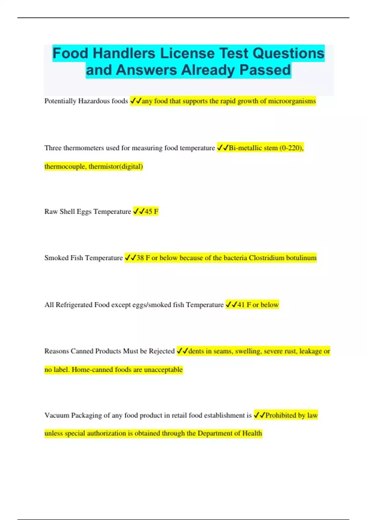 Food Handlers License Test Questions and Answers graded A+ 2023/2024 UPDATE
