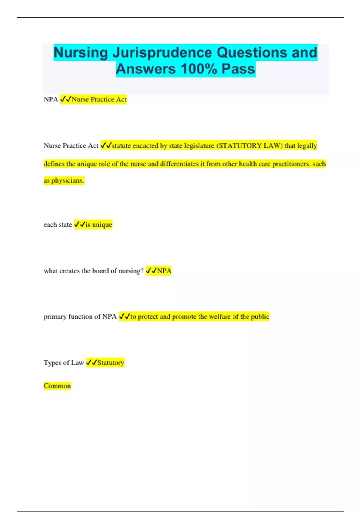 Nursing Jurisprudence Questions and Answers 100% Pass NPA Nurse Practice Act Nurse Practice Act statute enacted by the state legislature (STATUTORY LAW) that legally defines the unique role of the nurse and differentiates it from other health care practitioners, such as physicians. each state is unique what creates the board of nursing? NPA the primary function of the NPA to protect and promote the welfare of the public Types of Law Statutory Common Statutory Law NPA legally defines the unique role of the nurse and differentiates it from other health care practitioners Common Law aka judicial law -falls outside the realm of constitutional, statutory, and administrative law Assault threat or attempt to harm another *A nurse may be accused of assault if he or she verbally threatens to restrain a client unnecessarily Battery making bodily contact without consent includes: touching a person's body, clothing, chair, or bed False Imprisonment unlawful restraint or restriction of a person's freedom of movement forced confinement is legal under 3 conditions: *judicial restraining order (inmate