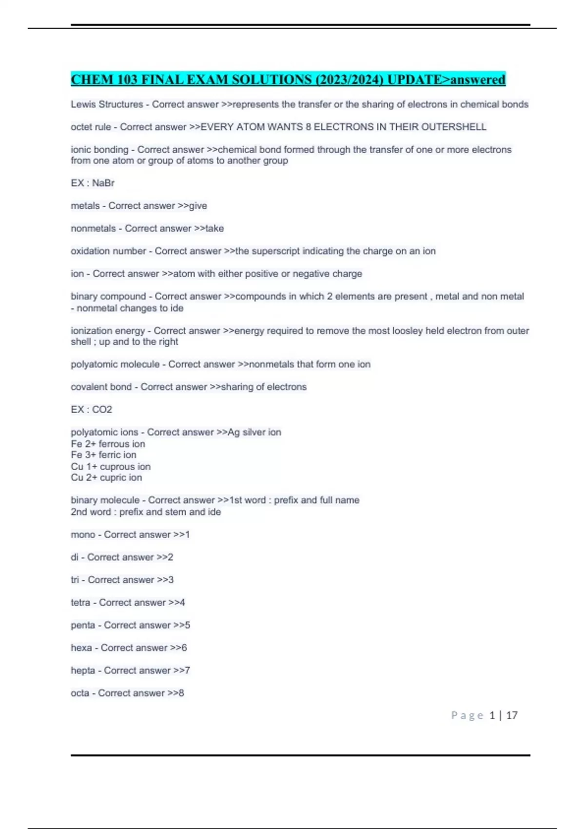 CHEM 103 FINAL EXAM SOLUTIONS (2023/2024) UPDATEanswered