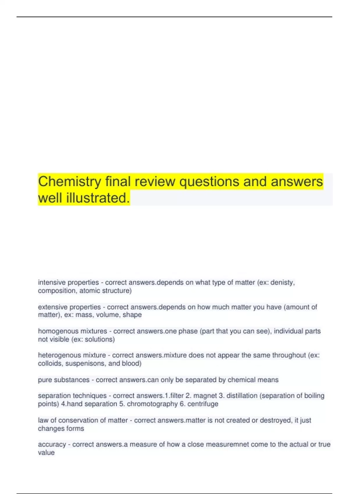 Chemistry final review questions and answers well illustrated. intensive properties - correct ds on what type of matter (ex: denisty, composition, atomic structure) extensive properties - correct ds on how much matter you have (amount of matter), ex: mass, volume, shape homogenous mixtures - correct phase (part that you can see), individual parts not visible (ex: solutions) heterogenous mixture - correct re does not appear the same throughout (ex: colloids, suspenisons, and blood) pure substances - correct only be separated by chemical means separation techniques - correct r 2. magnet 3. distillation (separation of boiling points) separation 5. chromotography 6. centrifuge law of conservation of matter - correct r is not created or destroyed, it just changes forms accuracy - correct answers.a measure of how a close measuremnet come to the actual or true value precision - correct answers.a measure of how close a series of measurements are to one another percent error - correct answers.(|experimental value-accepted value|/accepted value) x 100 adding or subtracting sig figs - correct to the least # of decimal places multiply/ divide sig figs - correct answer to least # of sig figs evidence of a chemical change - correct change, gas, water is a new product density - correct intensive property that depends on the composition of a substance, used to identify a substance, d=m/v atom - correct smallest particle of an element that retains its identity in a chemical reaction Democritus - correct answers.1st person to identiy the atom John Dalton - correct answers.1st theory to relate chemical changes to events at the atomic level. his theory: 1. all elements are composed of tiny indivisible molecules called atoms 2. atoms of the same element are the same 3. atoms of different elements can physically mix together 4. atoms of different elements can chemically combine to form a compound William Crookes - correct ted the cathode ray tube J.J. Thompson - correct vered the electron. Thought the atom was a positive sphere with negatively charged electrons throughout: plum pudding model Ernest Rutherford - correct the nucleus; gold foil experiment, used (positive) alpha particles and a narrow beam of particles directed at a sheet of gold Neils Bohr - correct rons move in a circular orbit at fixec distances from the nucleus, an electron can gain or lose energy by changing its orbit; planetary model CHADWICK - correct neutron Erwin Schrodinger and quantum mechanics - correct ron clouds Medeleev - correct shed a table of elements (periodic table), arranged the elements in order of increasing atomic mass; found repating patterns in properties, and left empy spaces in the table Moseley - correct mined atomic # for each known element; arrangted the elements in order of increasing atomic number; "father of the modern perodic table" period - correct ontal row of elements arranged in order of increasing atomic number's family - correct ns of related elements proton - correct answers.+1 charge, 1 amu, located in the nucleus
