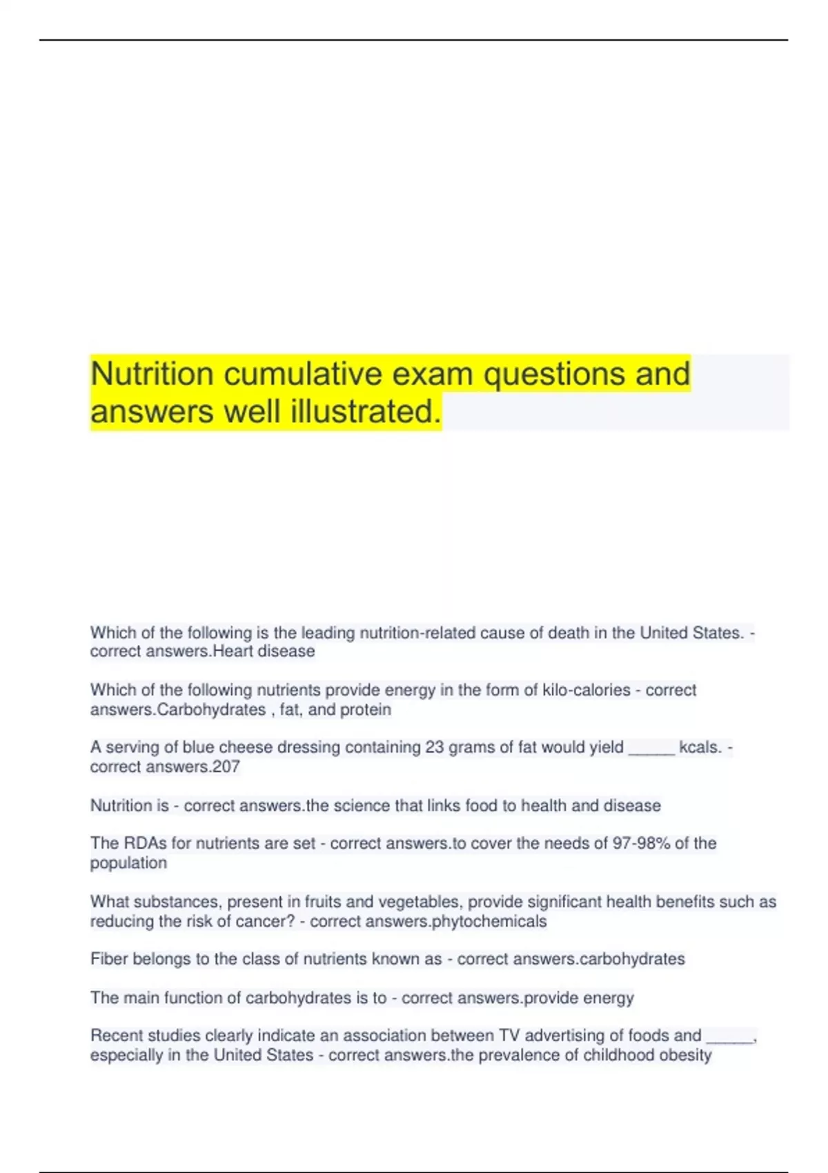 Nutrition cumulative exam questions and answers well illustrated. Which of the following is the leading nutrition-related cause of death in the United States. - correct answers.Heart disease Which of the following nutrients provide energy in the form of kilo-calories - correct answers.Carbohydrates , fat, and protein A serving of blue cheese dressing containing 23 grams of fat would yield _____ kcals. - correct answers.207 Nutrition is - correct science that links food to health and disease The RDAs for nutrients are set - correct cover the needs of 97-98% of the population What substances, present in fruits and vegetables, provide significant health benefits such as reducing the risk of cancer? - correct chemicals Fiber belongs to the class of nutrients known as - correct hydrates The main function of carbohydrates is to - correct de energy Recent studies clearly indicate an association between TV advertising of foods and _____, especially in the United States - correct prevalence of childhood obesity Which of the following is an example of phytochemical - correct enoids Minerals can - correct e part of the body structural systems Which of the following nutrients can directly supply energy for human use - correct s The freshman 15 is the term used to describe the - correct t of weight (in pounds) typically gained during the freshman year of college Which statement best describe nutrient density - correct me foods that have the most nutrients when compared to their kilo-calories The acronym RDA stands for - correct answers.Recommended Dietary Allowance The essential nutrients - correct t be made by the body and therefore must be consumed to maintain health The dietary Guidelines emphasize - correct tion of total calories, sugar-sweetened beverages, saturated fat, and sodium. According to MyPlate, eggs belong in the ___ group - correct in When it comes to choosing fruits, the Dietary Guidelines recommend - correct ing only whole, fresh fruits Margaret, an elderly woman, needs to limit her kilocalorie intake without sacrificing needed nutrients. Keeping in mind MyPlate, which of the following could she do? - correct ully select foods rich in nutrients but low in calories Kate consumes 1,900 kilocalories each day. She requires 1,750 kilocalories to meet daily energy needs. Over time, Kate's kilocalorie consumption could lead to - correct nutrition Jeff, a world-class triathlete, visits a dietitian to obtain sports nutrition advice. During his visit, Jeff is asked to recall what he ate for the past 24 hours. Which part of a nutritional assessment is this? - correct answers.Dietary assessment Mrs. Mitchell was hospitalized after being found unconscious in her home. A dietitian conducted a nutritional assessment, noting the general appearance of Mrs. Mitchell's skin, eyes, and tongue. Which part of the assessment is this? - correct cal examination By law, which of the following food items must display a nutrition facts label? - correct of granola bars One serving of Raisin Bran cereal contains 50 percent of the 18 mg Daily Value for iron. How much iron will one serving of your cereal provide? - correct answers.9 ( 18 divides by 2) Looking at the ingredients list on a jar of spaghetti sauce, you see that olive oil is the second ingredient. This means that olive oil is - correct second most abundant ingredient by weight. The label on a package of Kool-Aid indicates that it contains Vitamin C. Listed is a percentage of the - correct answers.Daily Value Which government agency is responsible for regulating most U.S. food labeling - correct answers.Food and Drug Administration Added sugars - correct de sugars and other sweeteners that are added during food processing or cooking A comparison of the caloric content of a food to the weight of that food is - correct y density Where does digestion begin? - correct What structure prevents food from entering the trachea when you swallow? - correct ottis Which large blood vessel is the first to receive most recently eaten nutrients and transport them to the liver? - correct ic portal vein Which of the following body organs produce bile - correct Most chemical digestion takes place in the - correct intestine The stomach empties into the small intestine through the - correct ic sphincter The muscular contractions that move food through the digestive tract are called - correct talsis Where are most digestive enzymes produced - correct answers.Pancreas and small intestine Constipation can best be prevented by - correct g dietary fiber These protein-based substances enhance digestion by making chemical reactions more likely to happen. - correct es What substance helps suspend fat in a water digestive moisture, making fat more available to digestive enzymes - correct The villi of the small intestine - correct de an enormous surface area that facilitates absorption. In the passive absorption, nutrients enter the cell - correct a carrier The function of thick mucus in the stomach is to - correct ct stomach cells from acid and enzymes After digestion and absorption, which circulatory system carries fat and fat-soluble vitamins? - correct atic Nutrigenomics - correct of how food impacts health through its interaction with our genes and its subsequent effect on gene expression Most stomach ulcers are caused by _____ infection - correct answers.Helicobacter pylori