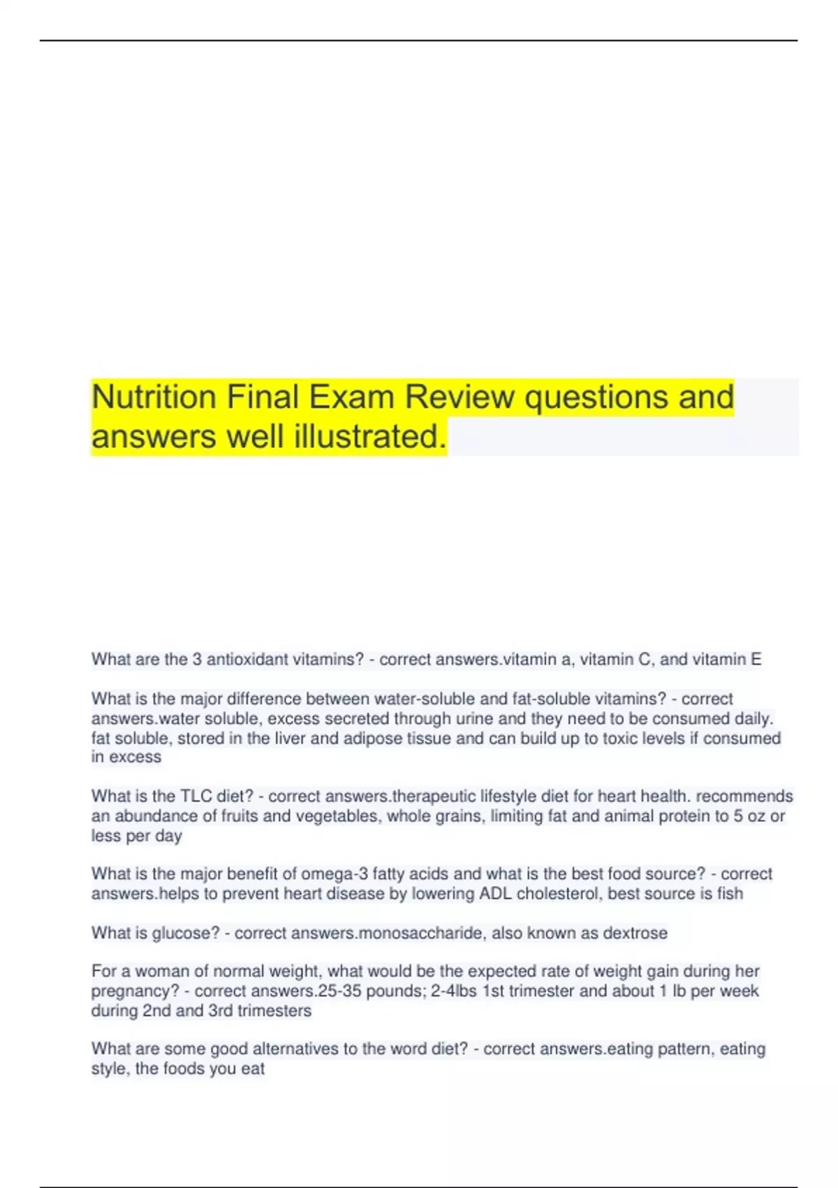 Nutrition Final Exam Review questions and answers well illustrated. What are the 3 antioxidant vitamins? - correct in a, vitamin C, and vitamin E What is the major difference between water-soluble and fat-soluble vitamins? - correct soluble, excess secreted through urine and they need to be consumed daily. fat soluble, stored in the liver and adipose tissue and can build up to toxic levels if consumed in excess What is the TLC diet? - correct peutic lifestyle diet for heart health. recommends an abundance of fruits and vegetables, whole grains, limiting fat and animal protein to 5 oz or less per day What is the major benefit of omega-3 fatty acids and what is the best food source? - correct to prevent heart disease by lowering ADL cholesterol, best source is fish What is glucose? - correct accharide, also known as dextrose For a woman of normal weight, what would be the expected rate of weight gain during her pregnancy? - correct answers.25-35 pounds; 2-4lbs 1st trimester and about 1 lb per week during 2nd and 3rd trimesters What are some good alternatives to the word diet? - correct g pattern, eating style, the foods you eat In terms of types of carbohydrates, what do Americans need to increase and what do we need to decrease? - correct ase: fiber decrease: added sugar What are our major food sources of protein? - correct od, white meat poultry, milk, cheese, yogurt, eggs, lean beef, and soy It has been proven that folate helps to prevent neural tube defects in unborn children. When does a pregnant woman need to consume folate for this full benefit? - correct answers.Pregnant women should start consuming folate before conception and for the first three months of pregnancy In what order are our macronutrients (protein, fat, carbohydrate) used for energy? - correct hydrate, fats, proteins What does the term non-nutritive mean? - correct des minimal or no calories What factors can impair vitamin D synthesis in the body? - correct reen, aging, dense clouds What are 3 types of fats and how do they differ from one another? - correct answers.Saturated fat, poly, mono. Saturated no double bonds, mono one bond, poly multiple bonds When vitamins are used in megadoses, they are considered therapeutic medications. Which vitamin is used in megadoses to help control cholesterol? - correct n What food sources are rich in potassium? - correct oes, sweet potatoes, bananas, soybeans, apricots What is the upper limit for sodium for adults and what is the primary dietary source of sodium? - correct answers.2,300 mg/day; processed foods What is anthropometric data? - correct rement of size and proportions of the human body What are the best sources of monounsaturated fats? - correct a oil, peanut oil, olive oil In what population are thirst cues delayed to the point where dehydration may have already occurred when they do become thirsty? - correct adult, and young children How is it determined that an infant is receiving adequate nourishment? - correct ed and measured at each doctor visit to determine adequacy of intake What is the primary site of digestion for carbohydrates, protein, and fat? - correct intestine What types of patients are referred to a registered dietitian for a nutrition assessment? - correct ate to high risk patients with suspected or confirmed protein-energy malnutrition What are good dietary sources of soluble fiber? - correct y, dried peas and beans, flax seed, fruit, oats What is the serving size for meat, chicken, and fish? - correct answers.3 ounces