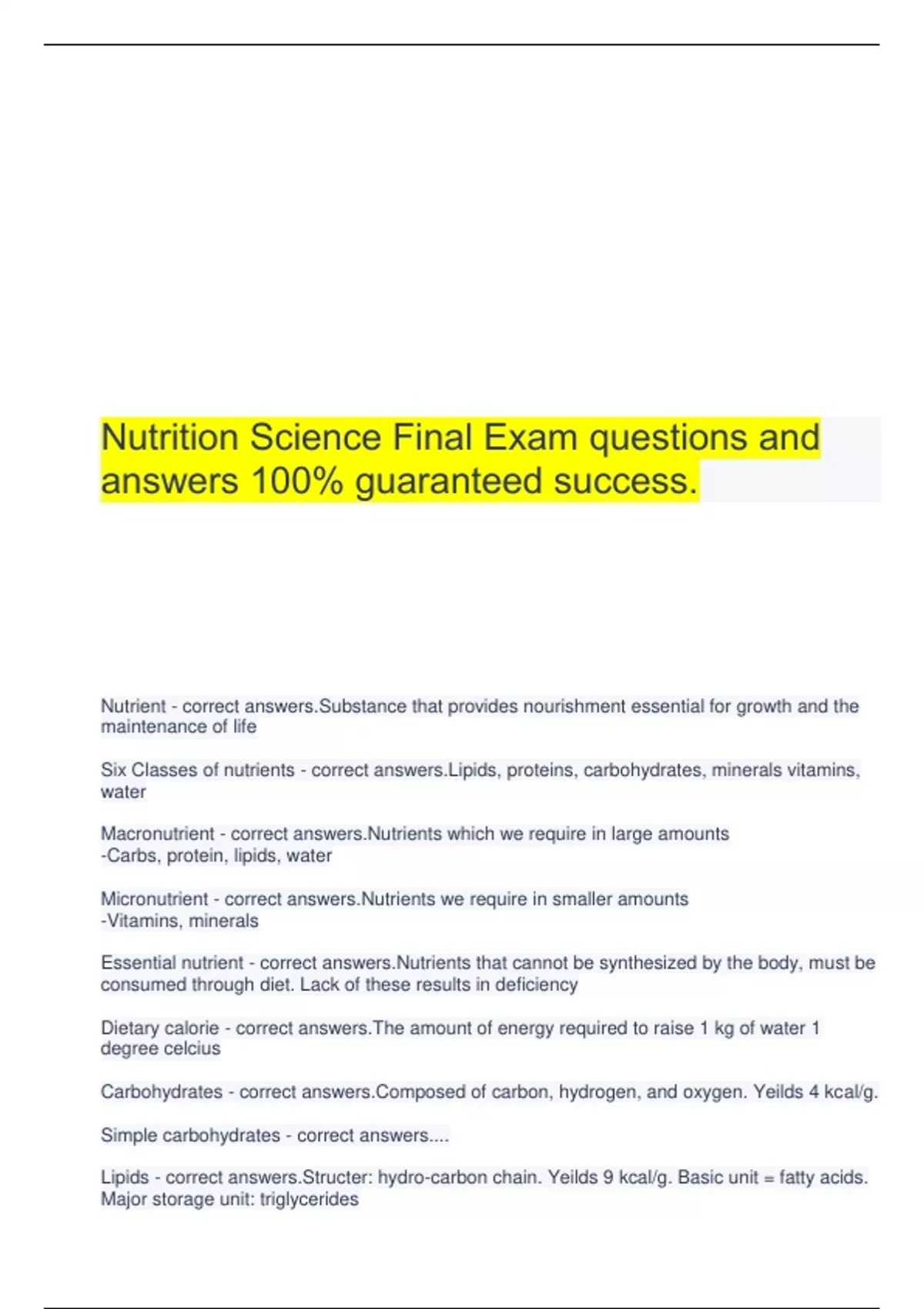Nutrition Science Final Exam questions and answers 100% guaranteed success.