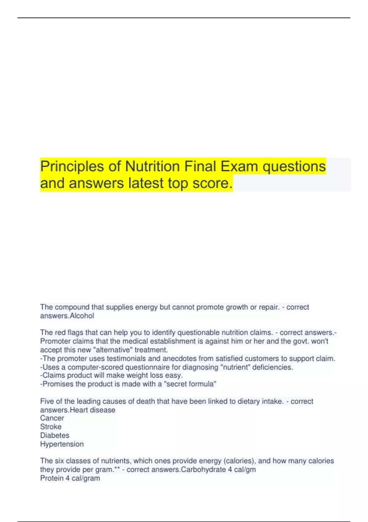 Principles of Nutrition Final Exam questions and answers latest top score. The compound that supplies energy but cannot promote growth or repair. - correct answers.Alcohol The red flags that can help you to identify questionable nutrition claims. - correct answers.-Promoter claims that the medical establishment is against him or her and the govt. won't accept this new "alternative" treatment. -The promoter uses testimonials and anecdotes from satisfied customers to support claim. -Uses a computer-scored questionnaire for diagnosing "nutrient" deficiencies. -Claims product will make weight loss easy. -Promises the product is made with a "secret formula" Five of the leading causes of death that have been linked to dietary intake. - correct answers.Heart disease Cancer Stroke Diabetes Hypertension The six classes of nutrients, which ones provide energy (calories), and how many calories they provide per gram.** - correct answers.Carbohydrate 4 cal/gm Protein 4 cal/gram Fat 9 cal/gram Vitamins Minerals Water The four factors that work together to determine a person's likelihood of suffering from a degenerative disease.** - correct answers.Heredity (genetics) Environment Social factors Lifestyle (behavior) Which nutrients provide energy? - correct answers.Carbohydrate Fat Protein Which nutrients do not provide energy? - correct answers.Vitamins Minerals Water Facts about the DRI: - correct answers.-Based on the latest scientific evidence from the National Academy of Sciences -For healthy people -Separate recommendations for genders and age groups -Used to evaluate diets for groups How the RDA is set for vitamins and minerals: - correct answers.Covers nutrient needs of 98% of the population The DRI for physical activity to reduce the risk of chronic disease: - correct answers.2 hours and 30 minutes each week The DRI for energy nutrients - correct answers.Carbohydrates 45-65% Fats 20-35% Protein 10-35% Equivalents of Grains:** - correct answers.1 oz. is about 1 slice of bread, about 1 cup of breakfast cereal or 1/2 cup of cooked rice, cereal, or pasta. Equivalents of Dairy Products:** - correct answers.1 cup= 1 1/2 oz. natural cheese, or 2 oz. processed cheese. Equivalents of Protein Foods:** - correct answers.1 oz.= 1 oz. meat, poultry, or fish; 1/4 cup cooked dry beans; 1 egg; 1 tbsp peanut butter; 1/2 oz. nuts/seeds. The body systems for which carbohydrates are the preferred energy source. - correct answers.Brain Nervous system Nutrients added to enriched grains. - correct answers.Thiamin Niacin Riboflavin Folate Iron The difference between starch and fiber. - correct answers.Fiber cannot be digested by human enzymes. The heath benefits of fiber. - correct answers.Obesity Digestive tract disorders Colon cancer Diabetes Heart disease The DRI committee's recommendation for added sugars in the diet. - correct answers.25% or less of total calories The number of servings of grains that should be whole grains. - correct answers.Half What happens to glucose after it has been absorbed. - correct answers.-It is used to fuel the cells -It is stored as glycogen in the muscles and liver -It is stored as fat What a person should eat to replenish blood glucose. - correct answers.A balanced meal containing foods that offer carbohydrates, protein, and fat. The functions of fats in the body: - correct answers.-Provide a concentrated source of energy to fuel the body's work. -Serve as the body's chief energy reserve -From the major components of cell membranes -Nourish skin and hair -Insulate the body from extremes of temperature -Cushion the vital organ to protect them from shock. -Provide raw materials for body compounds such as bile and vitamin D. The functions of fats in foods: - correct answers.-Provide calories -Provide satiety -Carry fat-soluble vitamins and essential fatty acids. -Contribute aroma and flavor. The number of calorie that a pound of body fat is worth - correct answers.3500 The three categories of lipids: - correct answers.Triglycerides Phospholipids Sterols The major lipids in foods and in the human body - correct answers.Triglycerides The differences between saturated and unsaturated fats: - correct answers.-Bonds between carbons -Saturated usually solid at room temperature -Saturated usually from animal sources The effects of omega-3 fatty acids in the body: - correct answers.-Reduced inflammation in arthritis and asthma -Reduced rates of heart disease -Reduced risk of some cancers The effects hydrogenation has on oils: - correct answers.-Reduces spoilage -Makes it harder -Trans fat formed The leading risk factors for heart disease: - correct answers.-High LDL -Low HDL -High blood pressure -Cigarette smoking -Obesity -Physical Inactivity -Diabetes -Unhealthy diet The effects of various kinds of fats on blood lipids and their food sources: - correct answers.-Saturated Fats: increases total cholesterol; Increases LDL-cholesterol. -Polyunsaturated Fat: Decrease total cholesterol; decrease LDL-cholesterol; Decrease HDL-cholesterol -Monounsaturated Fats: Decrease total cholesterol; decrease LDL-cholesterol without decreasing HDL-cholesterol. -Omega-3 Fat: Decrease total cholesterol; decrease LDL-cholesterol; increase HDL-cholesterol; decrease triglycerides -Trans fat: increases total cholesterol; increases LDL-cholesterol. The current recommendation for cholesterol level in the blood: - correct answers.<200 The most powerful influence on raising HDL-cholesterol levels: - correct answers.Regular physical activity The functions of protein: - correct answers.-Building material -Body structures -Enzymes -Hormones -Antibodies -Fluid balance -Acid-base balance -Transportation -Energy The element found in all proteins, but not in carbohydrates or fats: - correct answers.Nitrogen The definition of essential amino acids: - correct answers.Amino acids that cannot be synthesized by the body or synthesized in amounts sufficient to meet needs. Why carbohydrate and fat are said to be "protein sparing": - 