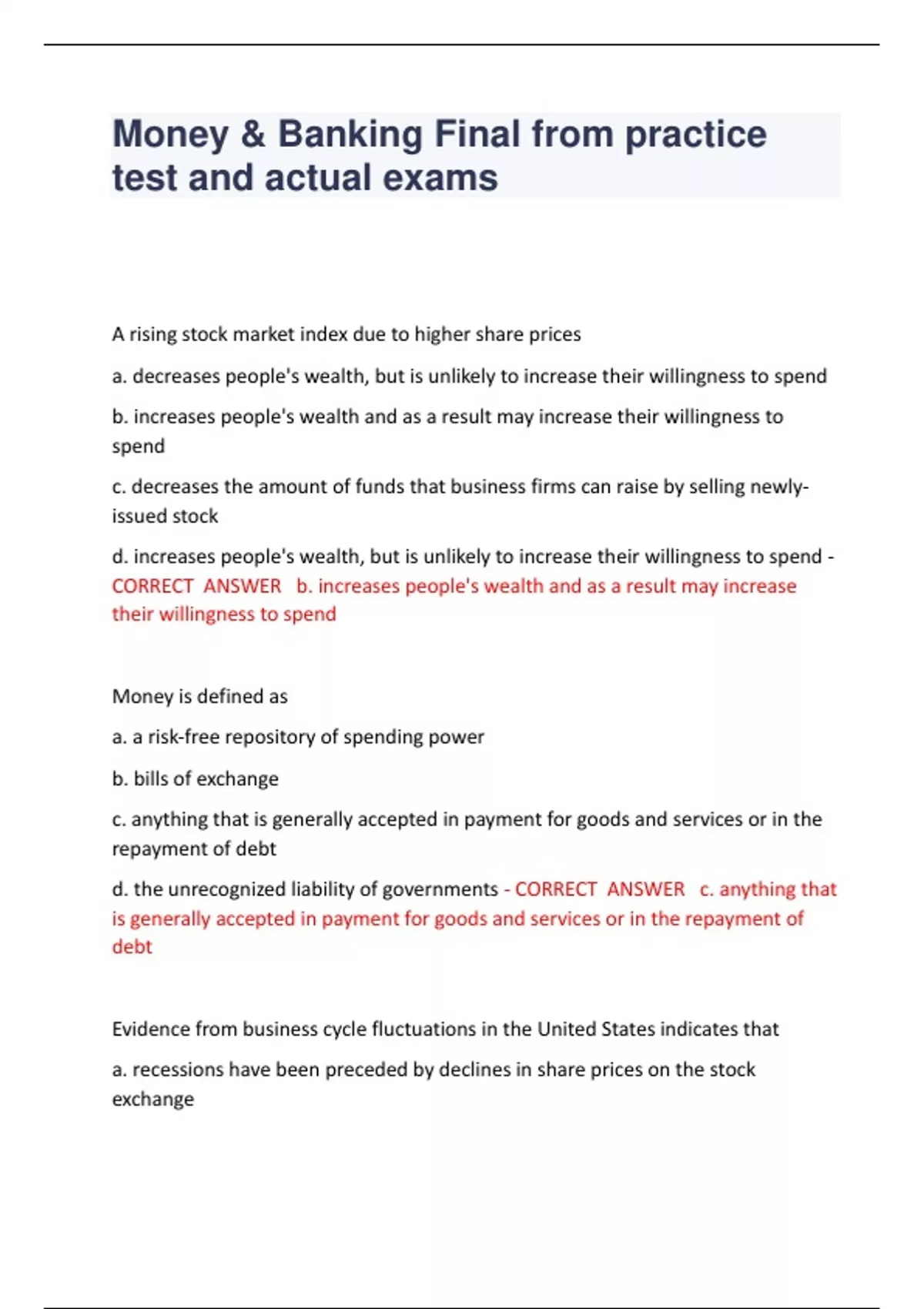 Money & Banking Final from practice test and actual exams A rising stock market index due to higher share prices a. decreases people's wealth, but is unlikely to increase their willingness to spend b. increases people's wealth and as a result may increase their willingness to spend c. decreases the amount of funds that business firms can raise by selling newlyissued stock d. increases people's wealth, but is unlikely to increase their willingness to spend - CORRECT ANSWER b. increases people's wealth and as a result may increase their willingness to spend Money is defined as a. a risk-free repository of spending power b. bills of exchange c. anything that is generally accepted in payment for goods and services or in the repayment of debt d. the unrecognized liability of governments - CORRECT ANSWER c. anything that is generally accepted in payment for goods and services or in the repayment of debt Evidence from business cycle fluctuations in the United States indicates that a. recessions have been preceded by declines in share prices on the stock exchange b. recessions have been preceded by dollar depreciation c. recessions have been preceded by a decline in the growth rate of money d. a negative relationship between money growth and general economic activity exists - CORRECT ANSWER c. recessions have been preceded by a decline in the growth rate of money Every financial market has the following characteristic: a. it allows loans to be made b. it channels funds from lenders-savers to borrowers-spenders c. it allows common stock to be traded d. it determines the level of interest rates - CORRECT ANSWER b. it channels funds from lenders-savers to borrowers-spenders Financial markets improve economic welfare because a. they allow consumers to time their purchase better b. they weed out inefficient firms c. they channel funds from investors to savers d. eliminate the need for indirect finance - CORRECT ANSWER a. they allow consumers to time their purchase better An important function of secondary markets is to a. make it easier for governments to raise taxes b. create a market for newly constructed houses c. make it easier to sell financial instruments to raise funds d. raise funds for corporations through the sale of securities - CORRECT ANSWER c. make it easier to sell financial instruments to raise funds Which of the following statements about the characteristics of debt and equity are true? a. debt is a claim on the issuer's assets, but equity is a claim on the issuer's income b. they can both be long-term financial instruments c. they can both be short-term financial instruments d. both (a) and (b) of the above e. both (a) and (c) of the ab