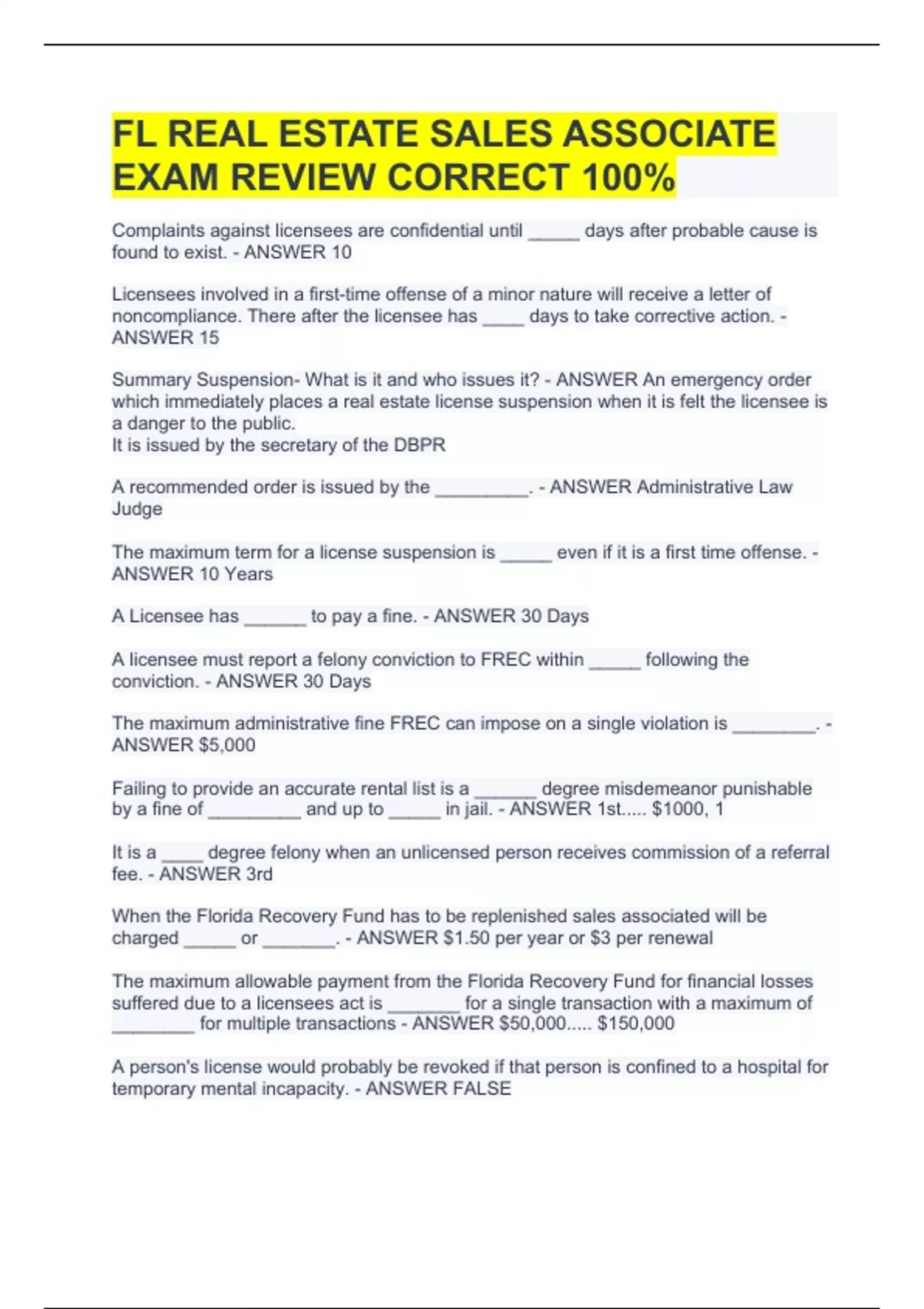 Complaints against licensees are confidential until _____ days after probable cause is found to exist. - ANSWER 10 Licensees involved in a first-time offense of a minor nature will receive a letter of noncompliance. There after the licensee has ____ days to take corrective action. - ANSWER 15 Summary Suspension- What is it and who issues it? - ANSWER An emergency order which immediately places a real estate license suspension when it is felt the licensee is a danger to the public. It is issued by the secretary of the DBPR A recommended order is issued by the _________. - ANSWER Administrative Law Judge The maximum term for a license suspension is _____ even if it is a first time offense. - ANSWER 10 Years A Licensee has ______ to pay a fine. - ANSWER 30 Days A licensee must report a felony conviction to FREC within _____ following the conviction. - ANSWER 30 Days The maximum administrative fine FREC can impose on a single violation is ________. - ANSWER $5,000 Failing to provide an accurate rental list is a ______ degree misdemeanor punishable by a fine of _________ and up to _____ in jail. - ANSWER 1st..... $1000, 1 It is a ____ degree felony when an unlicensed person receives commission of a referral fee. - ANSWER 3rd When the Florida Recovery Fund has to be replenished sales associated will be charged _____ or _______. - ANSWER $1.50 per year or $3 per renewal The maximum allowable payment from the Florida Recovery Fund for financial losses suffered due to a licensees act is _______ for a single transaction with a maximum of ________ for multiple transactions - ANSWER $50,000..... $150,000 A person's license would probably be revoked if that person is confined to a hospital for temporary mental incapacity. - ANSWER FAL
