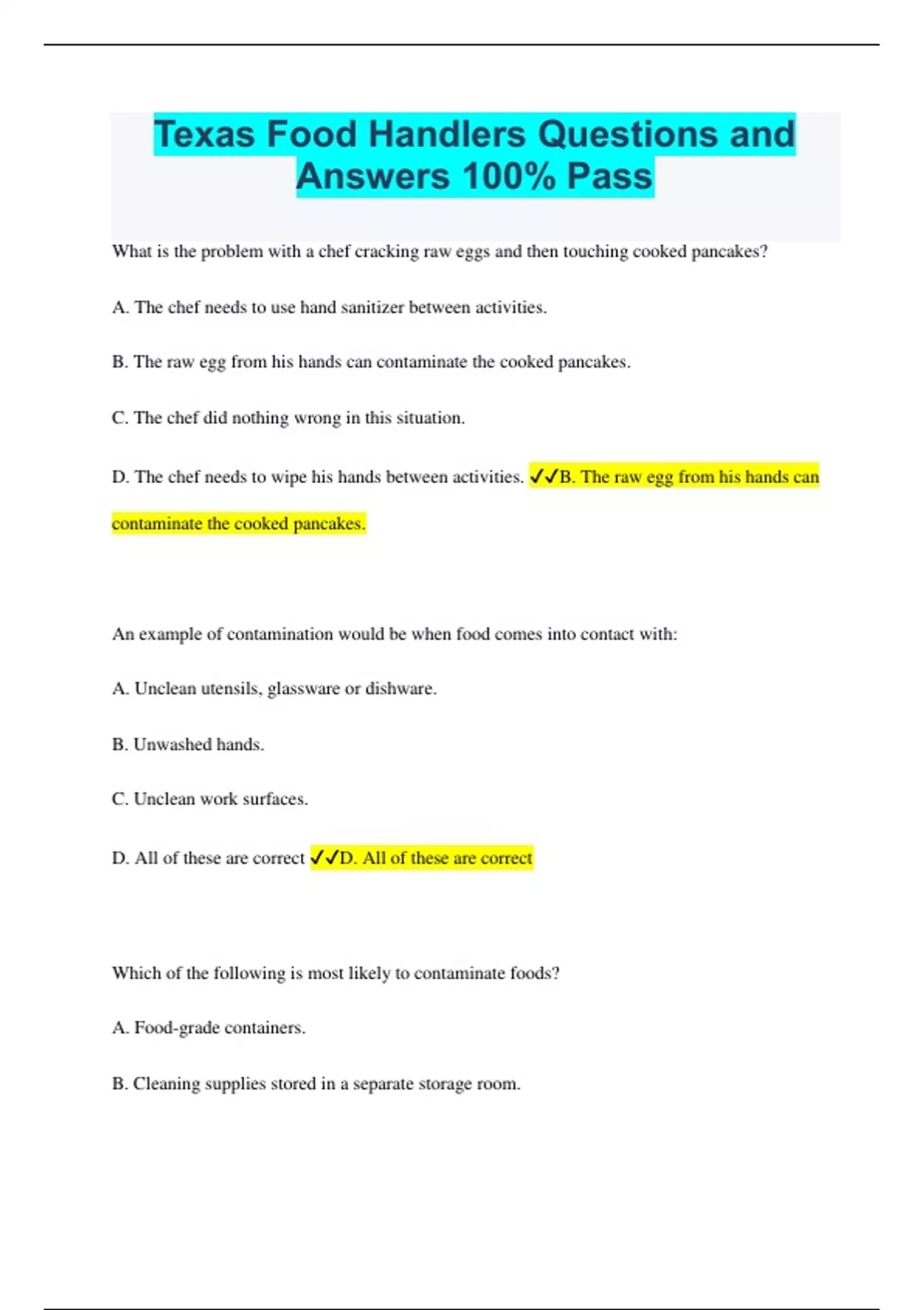 Texas Food Handlers Questions and Answers 100% Pass What is the problem with a chef cracking raw eggs and then touching cooked pancakes? A. The chef needs to use hand sanitizer between activities. B. The raw egg from his hands can contaminate the cooked pancakes. C. The chef did nothing wrong in this situation. D. The chef needs to wipe his hands between activities. B. The raw egg from his hands can contaminate the cooked pancakes. An example of contamination would be when food comes into contact with: A. Unclean utensils, glassware, or dishware. B. Unwashed hands. C. Unclean work surfaces. D. All of these are correct D. All of these are correct Which of the following is most likely to contaminate foods? A. Food-grade containers. B. Cleaning supplies stored in a separate storage room. C. All of these are correct. D. Raw meat next to cooked meat. D. Raw meat next to cooked meat. Which of the following foods should require the MOST careful attention? A. Whole apples B. Bottles of ketchup C. Meat and poultry D. Dried beans C. Meat and poultry What does TCS stand for? A. Timed Cooking Station B. Time/Temperature Control for Safety C. Teflon Coated Silverware D. Tender Chicken Strips B. Time/Temperature Control for Safety What is a good practice while working in food service? A. Wearing long fingernails, if professionally manicured. B. Wearing your fingernails sho