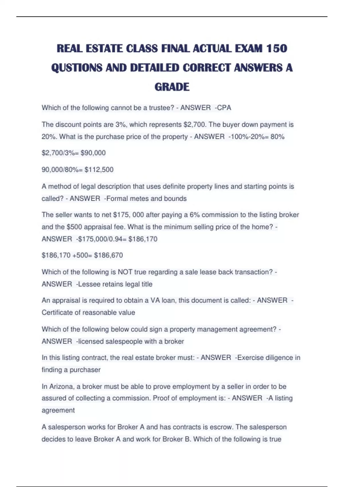 REAL ESTATE CLASS FINAL ACTUAL EXAM 150 QUSTIONS AND DETAILED CORRECT ANSWERS A